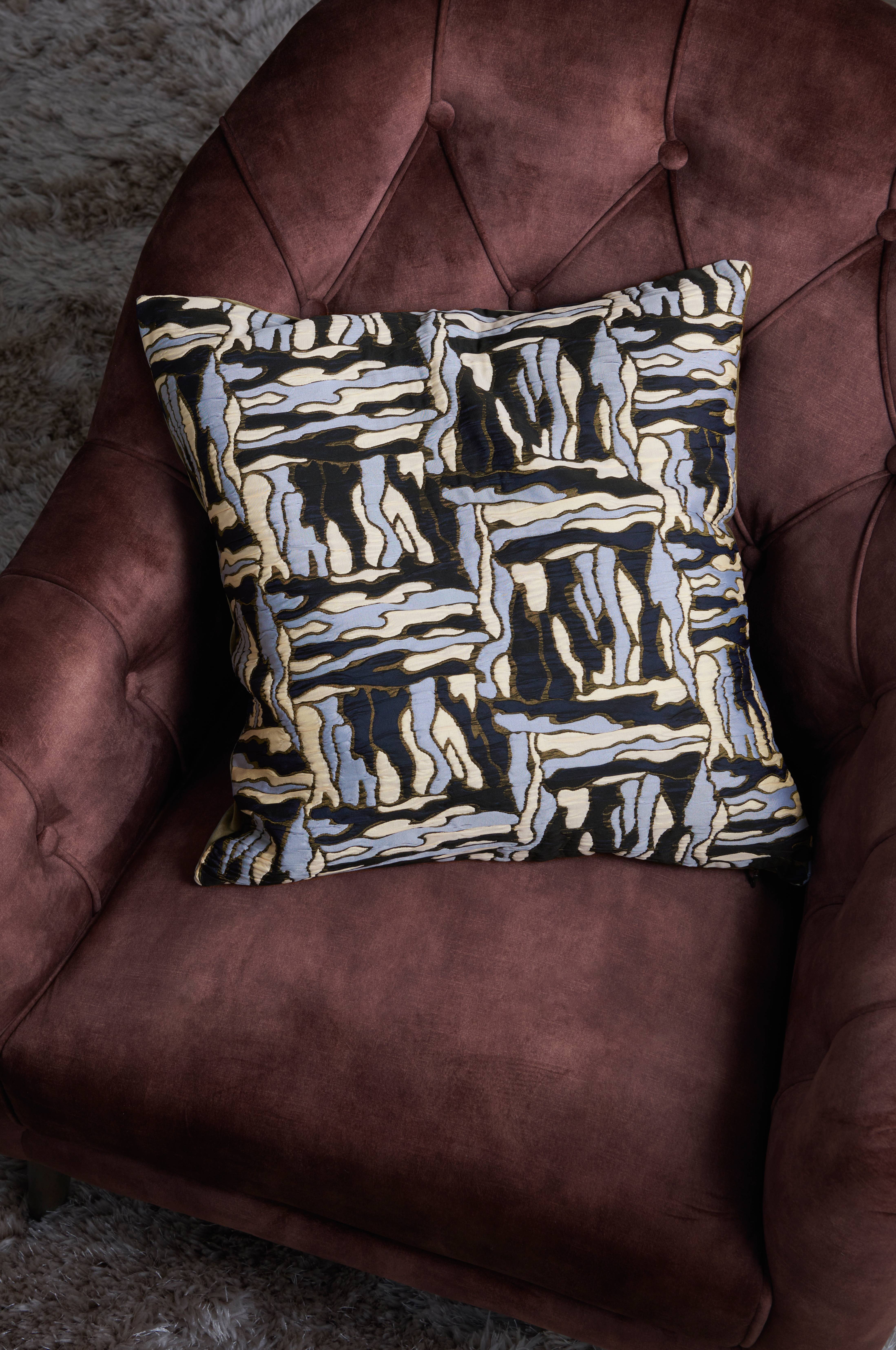 Pudebetræk med forside i jacquardvævet stof og bagside i velour. Metallynlås i bunden.