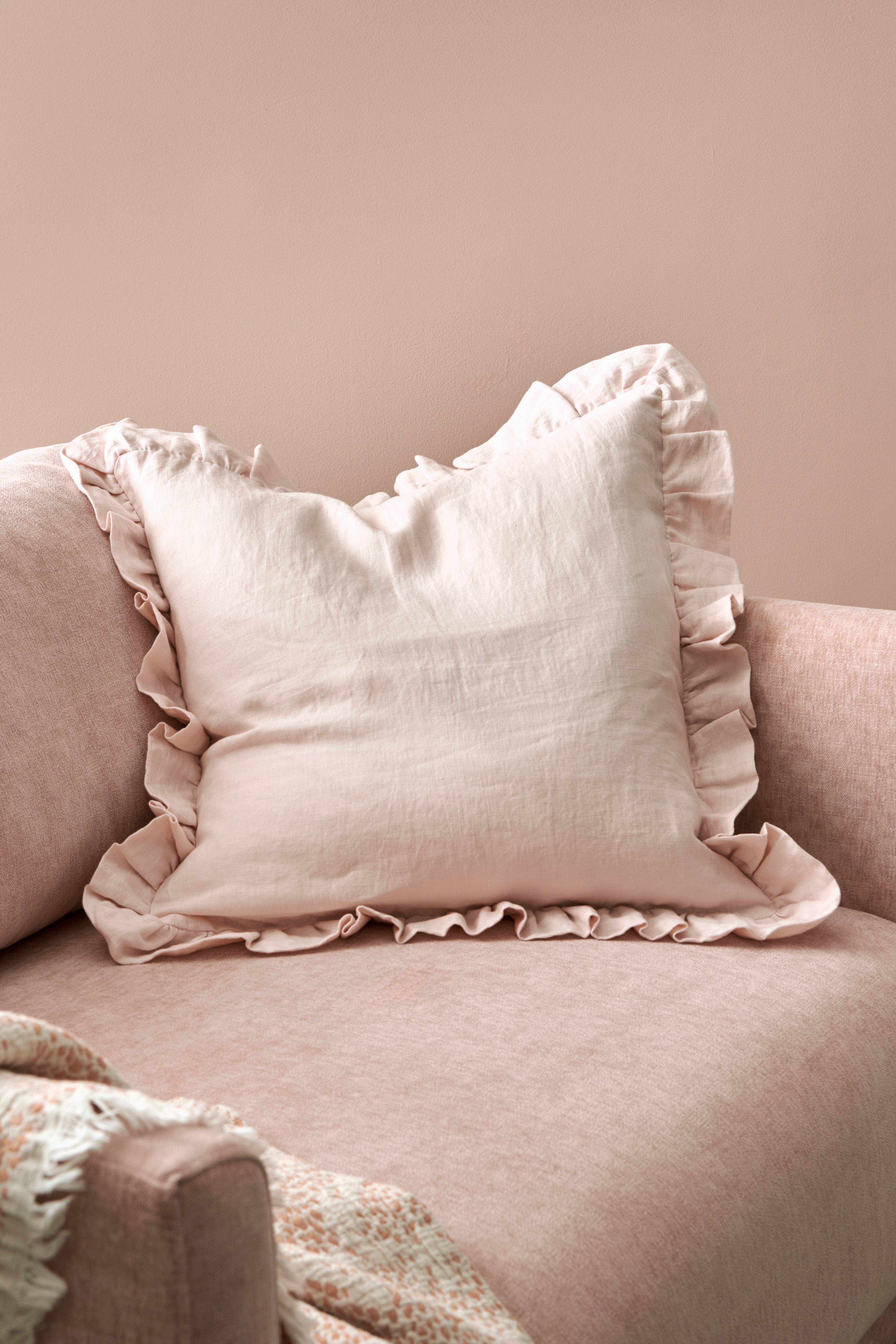 Pudebetræk i blød, vasket hørkvalitet af fransk hør. Flæse rundt om og lynlås bagpå. Str. 50x50 cm + 4,5 cm flæse.