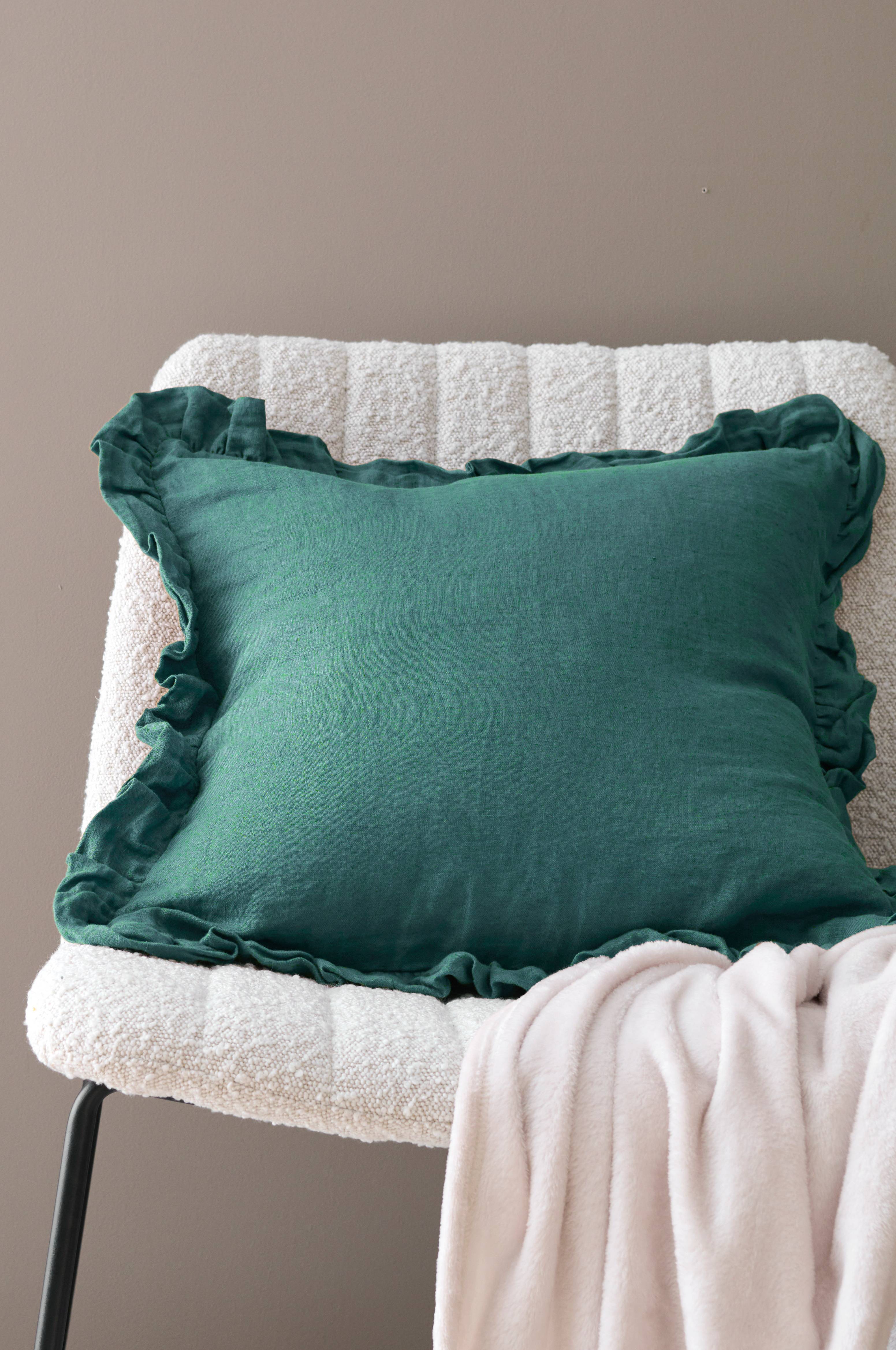 Pudebetræk i blød, vasket hørkvalitet af fransk hør. Flæse rundt om og lynlås bagpå. Str. 50x50 cm + 4,5 cm flæse.