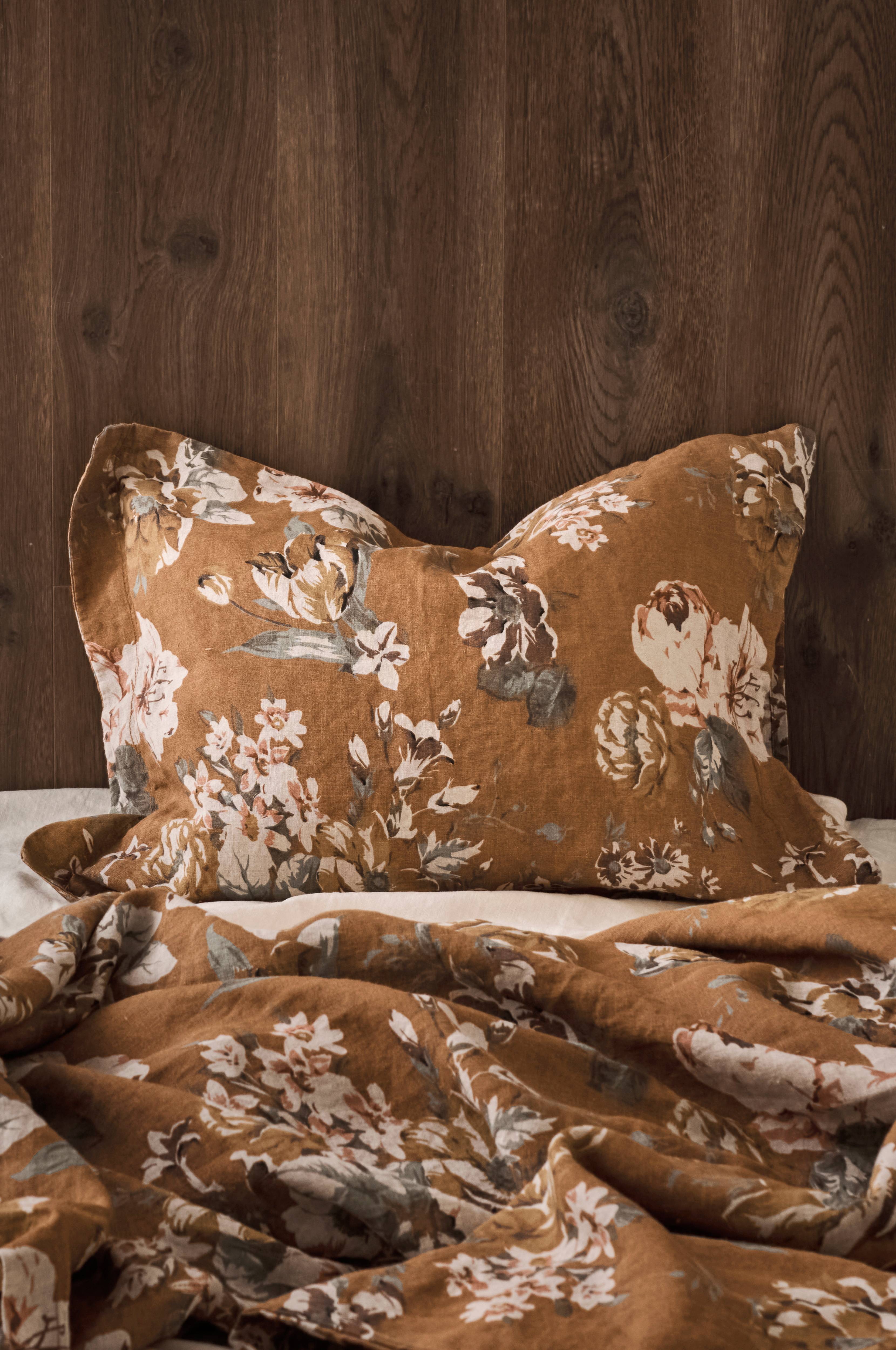 Pudebetræk i vintagevasket hørkvalitet af fransk hør med printet rosemønster på synlig lærredsbund. Str. 50x60 cm + 5 cm vinge på kortsiderne.