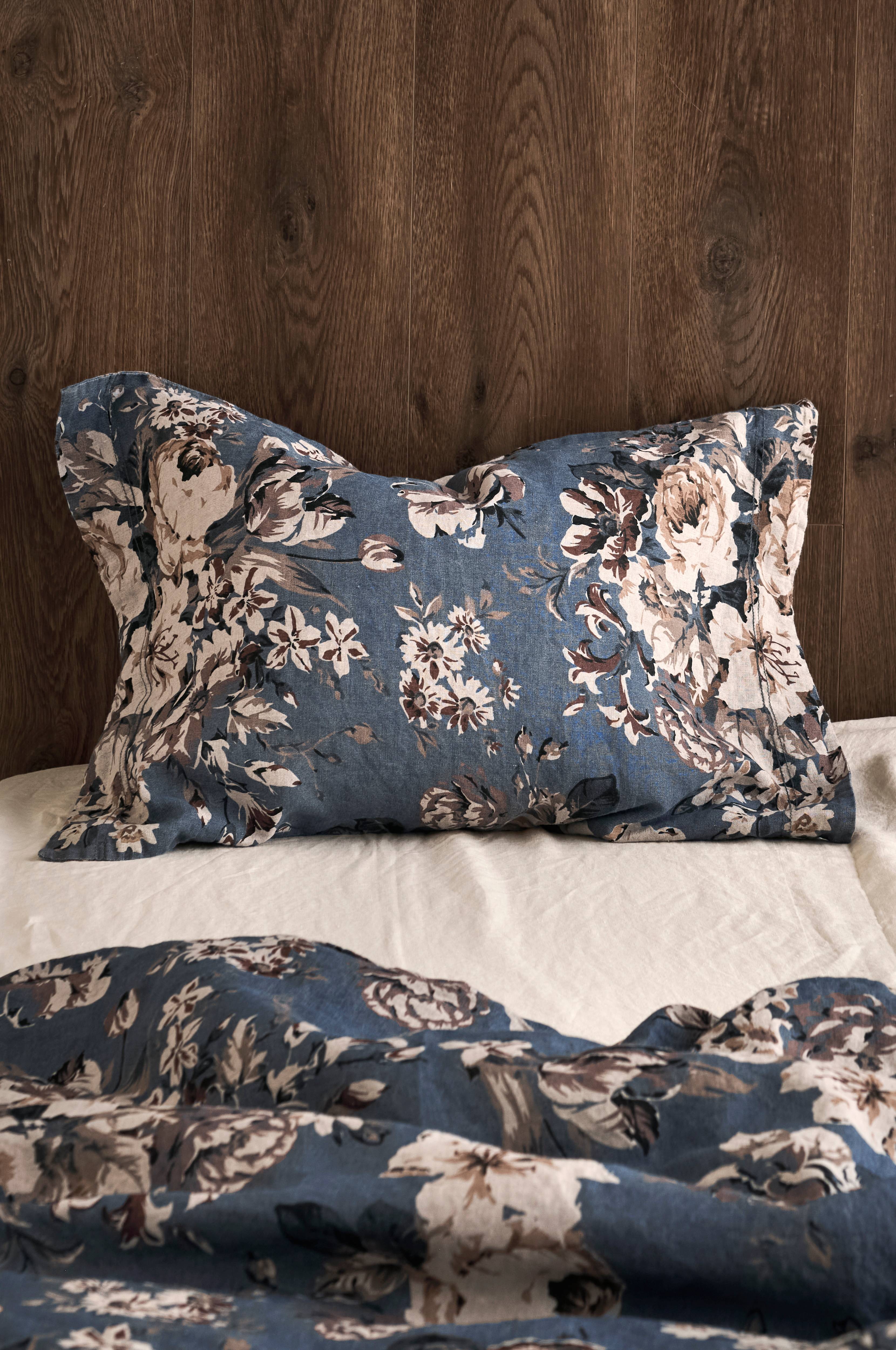 Pudebetræk i vintagevasket hørkvalitet af fransk hør med printet rosemønster på synlig lærredsbund. Str. 50x60 cm + 5 cm vinge på kortsiderne.
