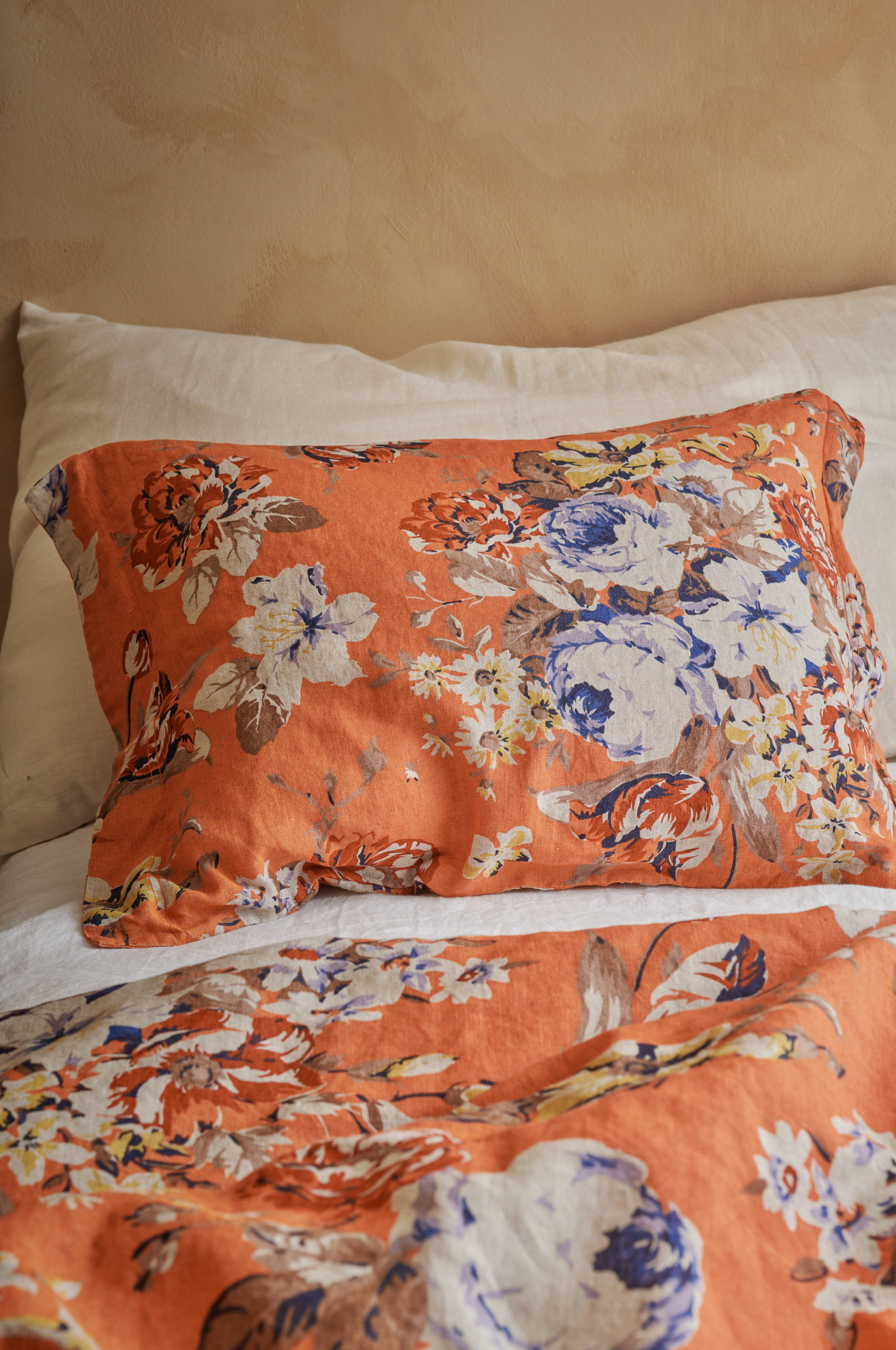 Pudebetræk i vintagevasket hørkvalitet af fransk hør med printet rosemønster på synlig lærredsbund. Str. 50x60 cm + 5 cm vinge på kortsiderne.