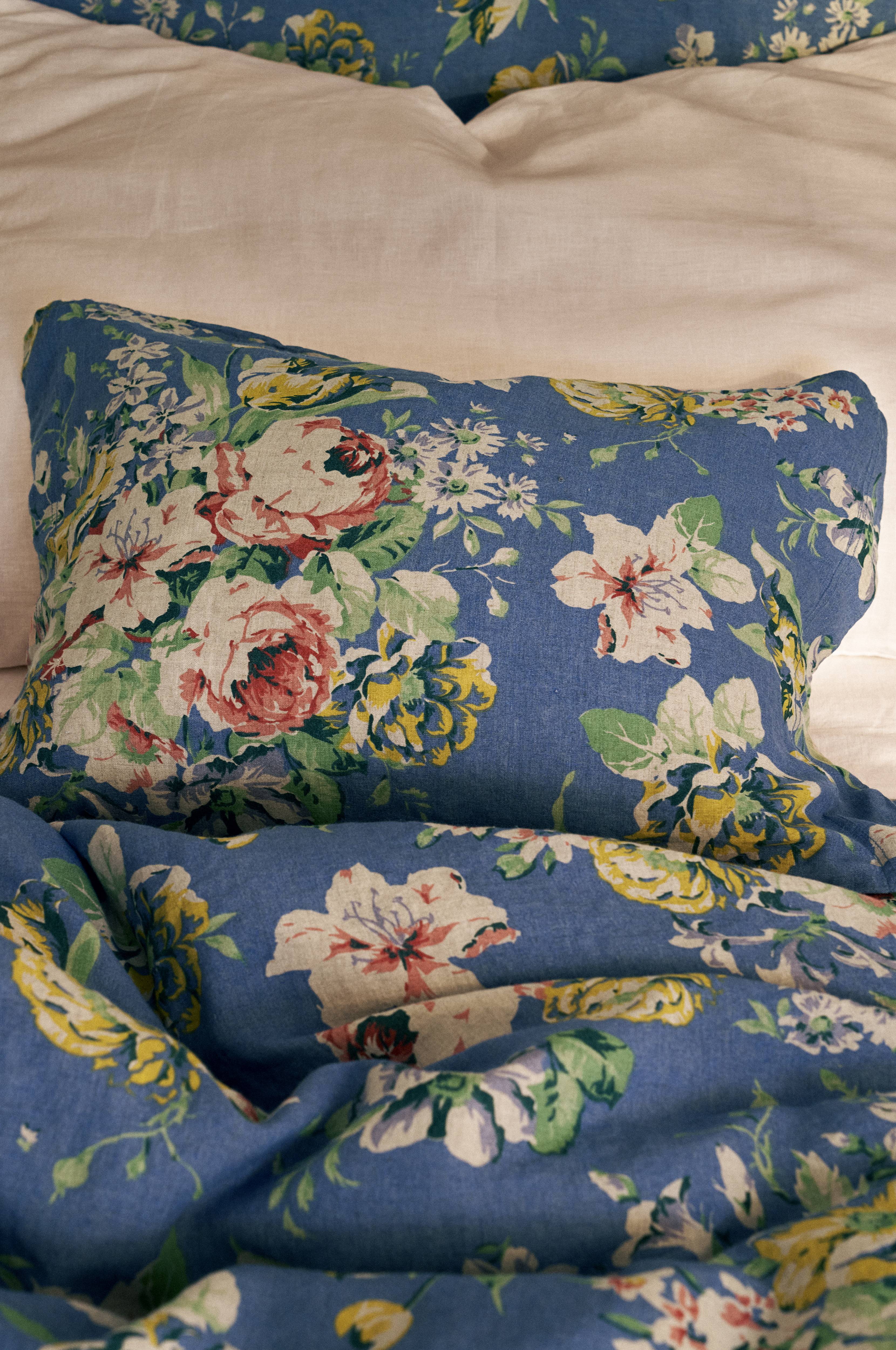 Pudebetræk i vintagevasket hørkvalitet af fransk hør med printet rosemønster på synlig lærredsbund. Str. 50x60 cm + 5 cm vinge på kortsiderne.