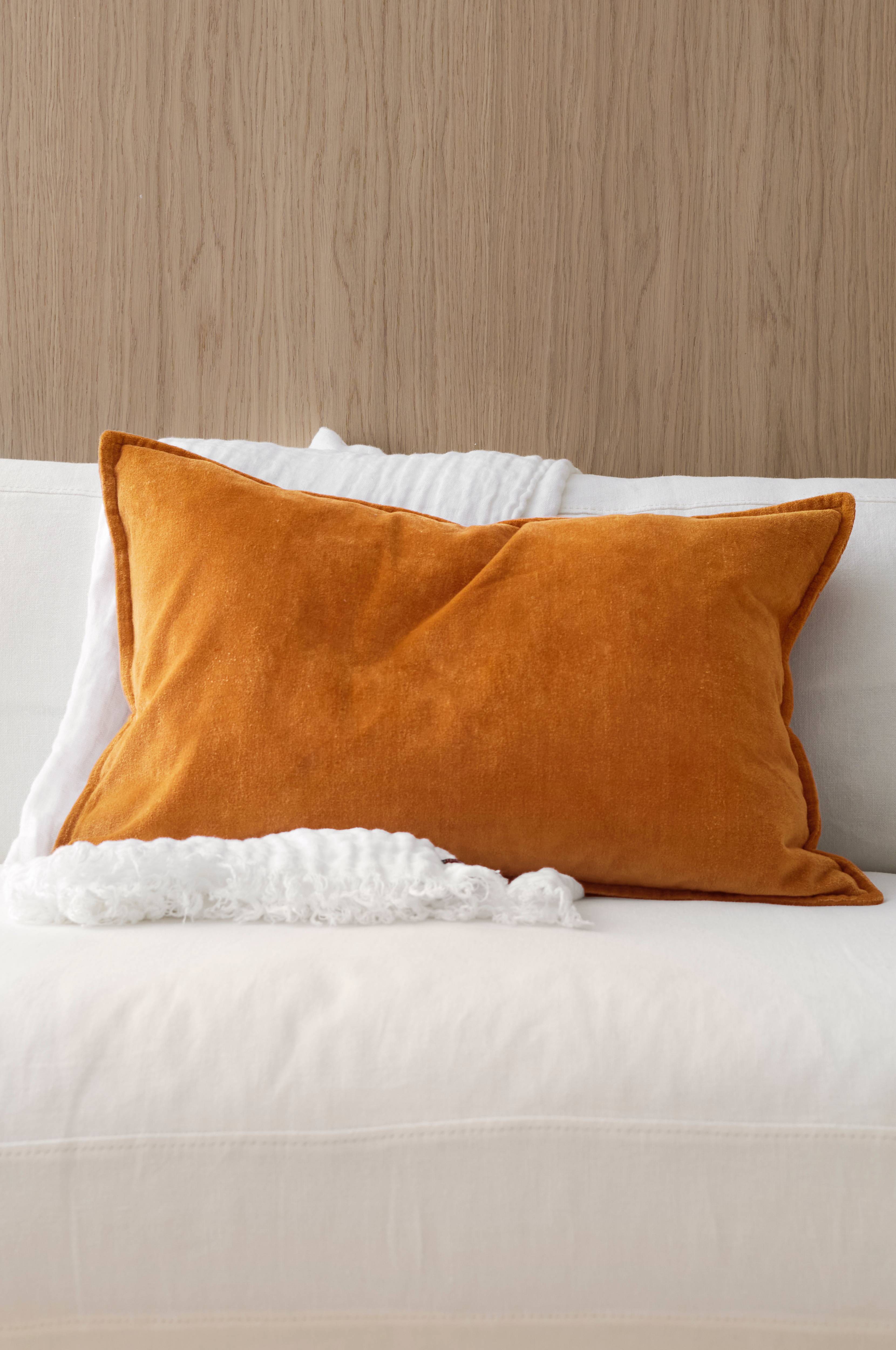 Pudebetræk i velour af bomuld med pyntesøm rundt om. Lynlås i bunden på bagsiden. Str. 40x60 cm.