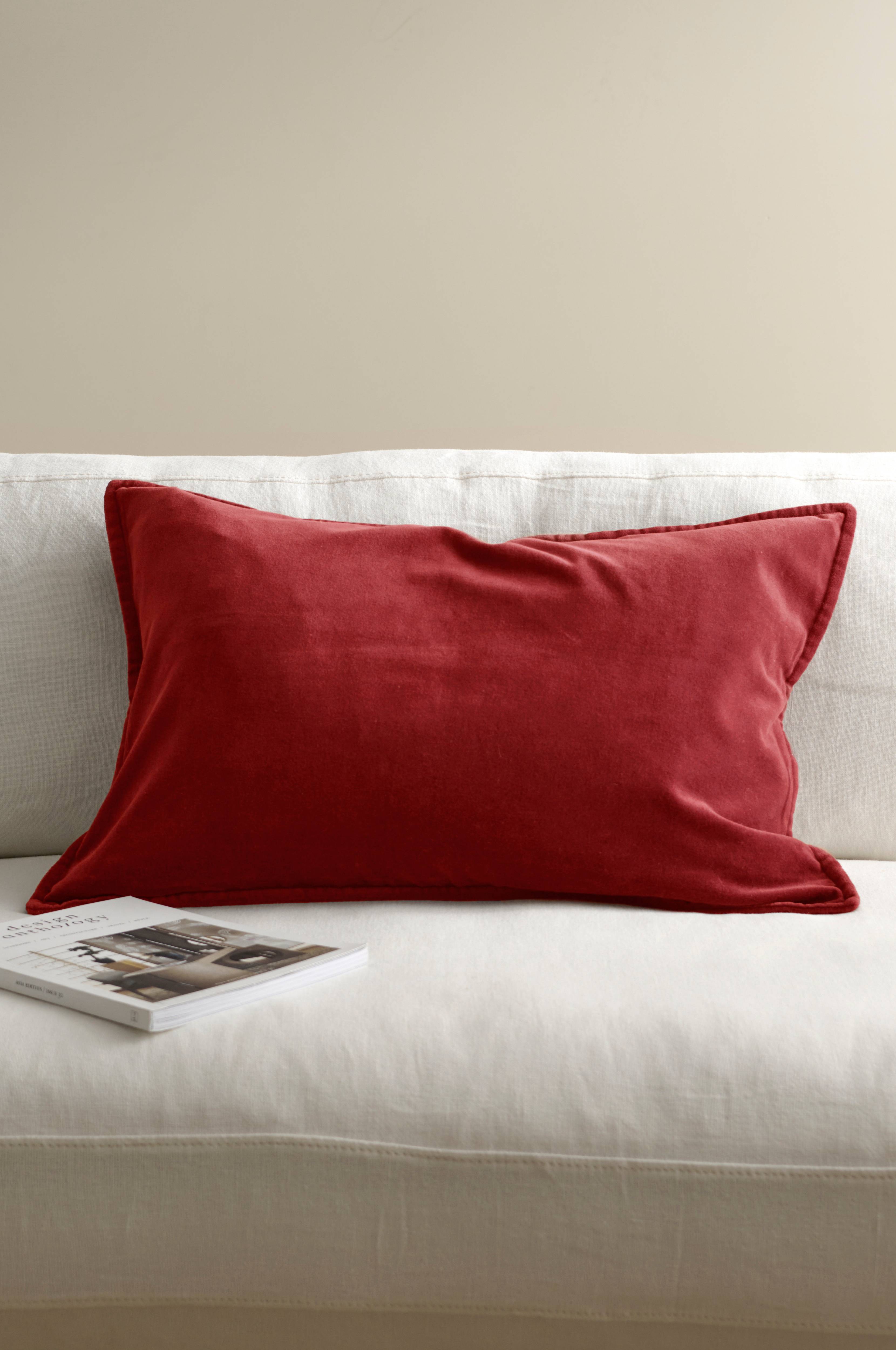 Pudebetræk i velour af bomuld med pyntesøm rundt om. Lynlås i bunden på bagsiden. Str. 40x60 cm.