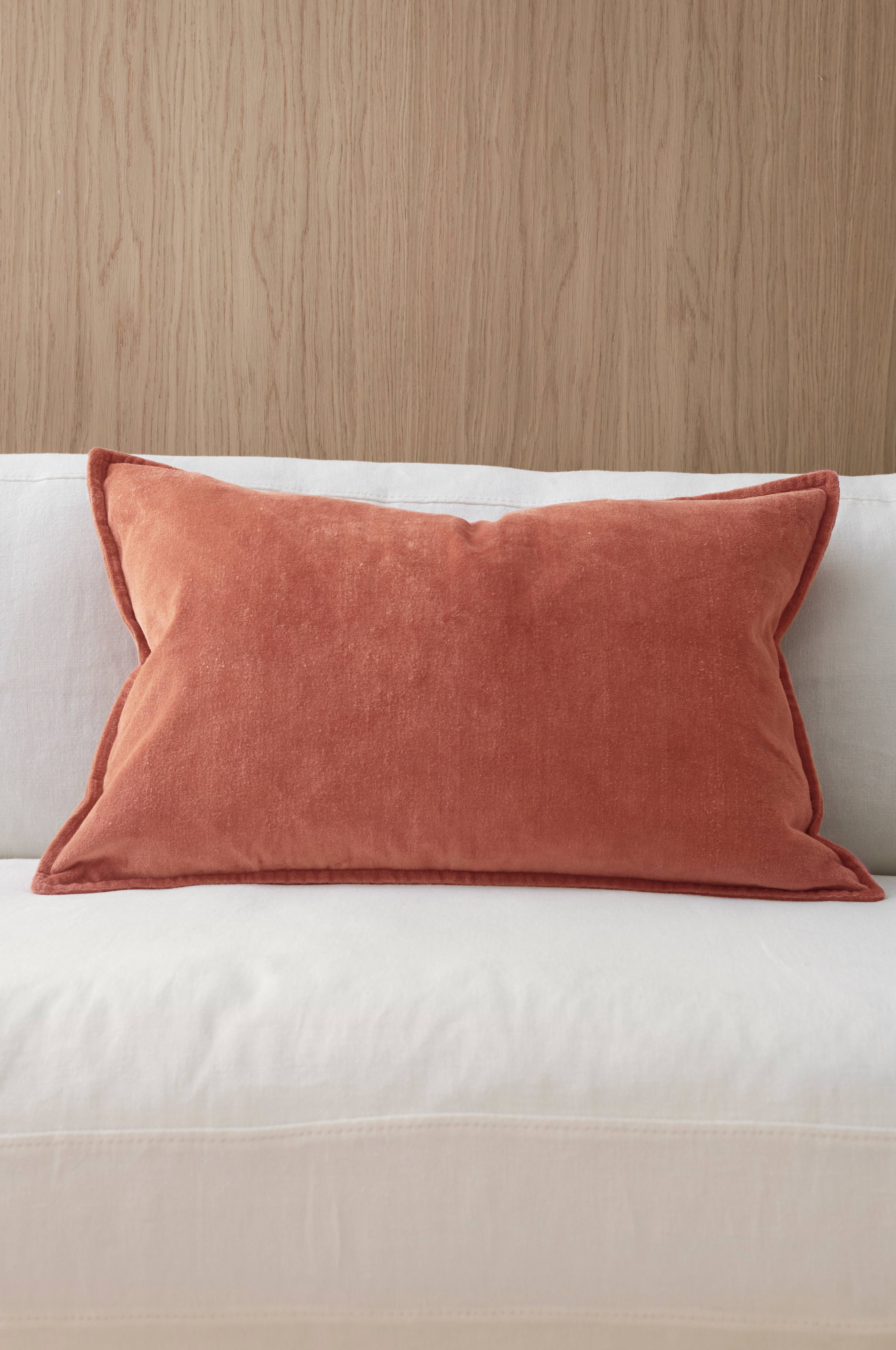 Pudebetræk i velour af bomuld med pyntesøm rundt om. Lynlås i bunden på bagsiden. Str. 40x60 cm.