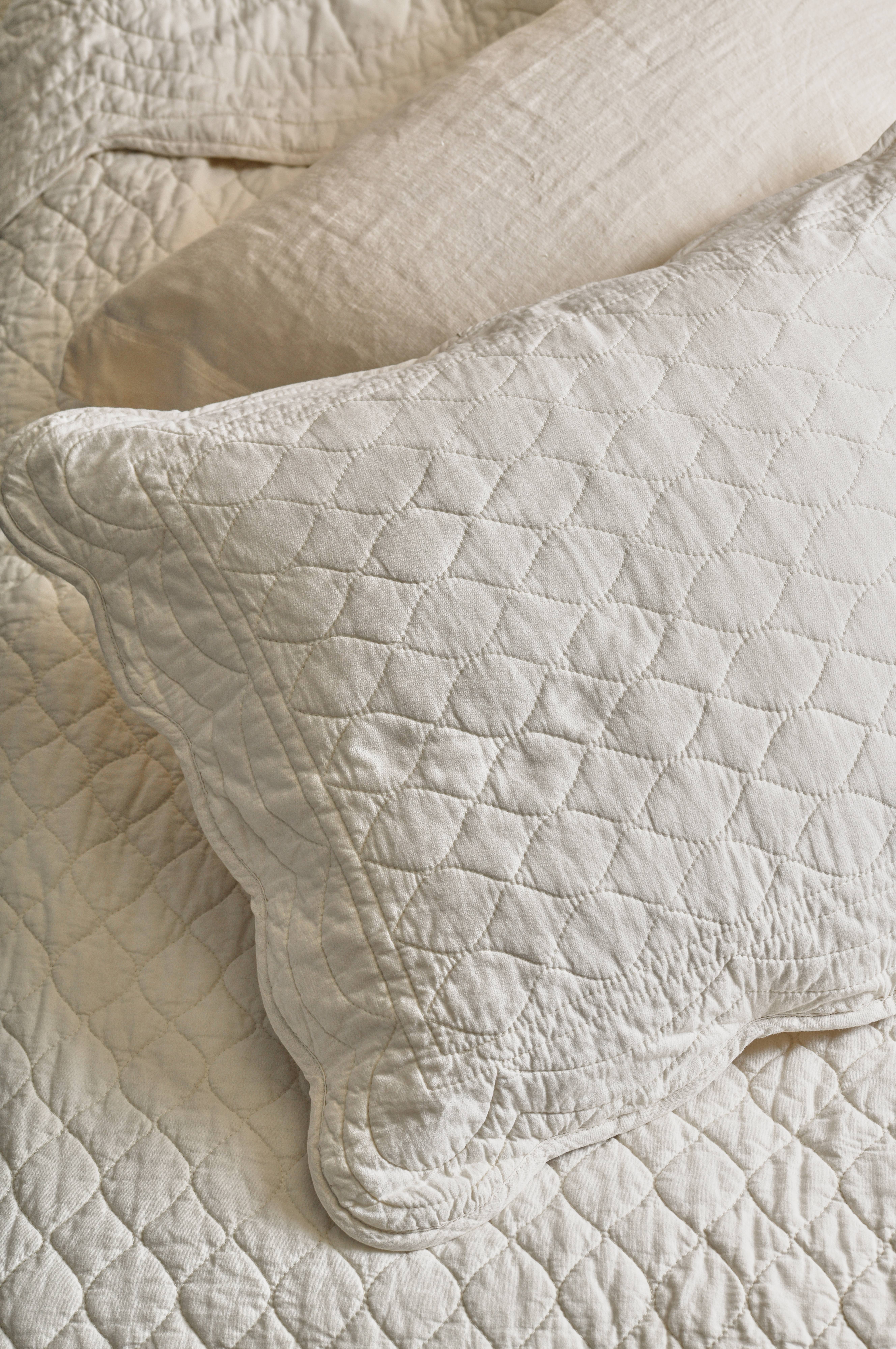 Quiltet, tyndt pudebetræk i vasket bomuld. Buede kanter rundt om med kantbånd. Kuvertlukning (ingen lynlås).