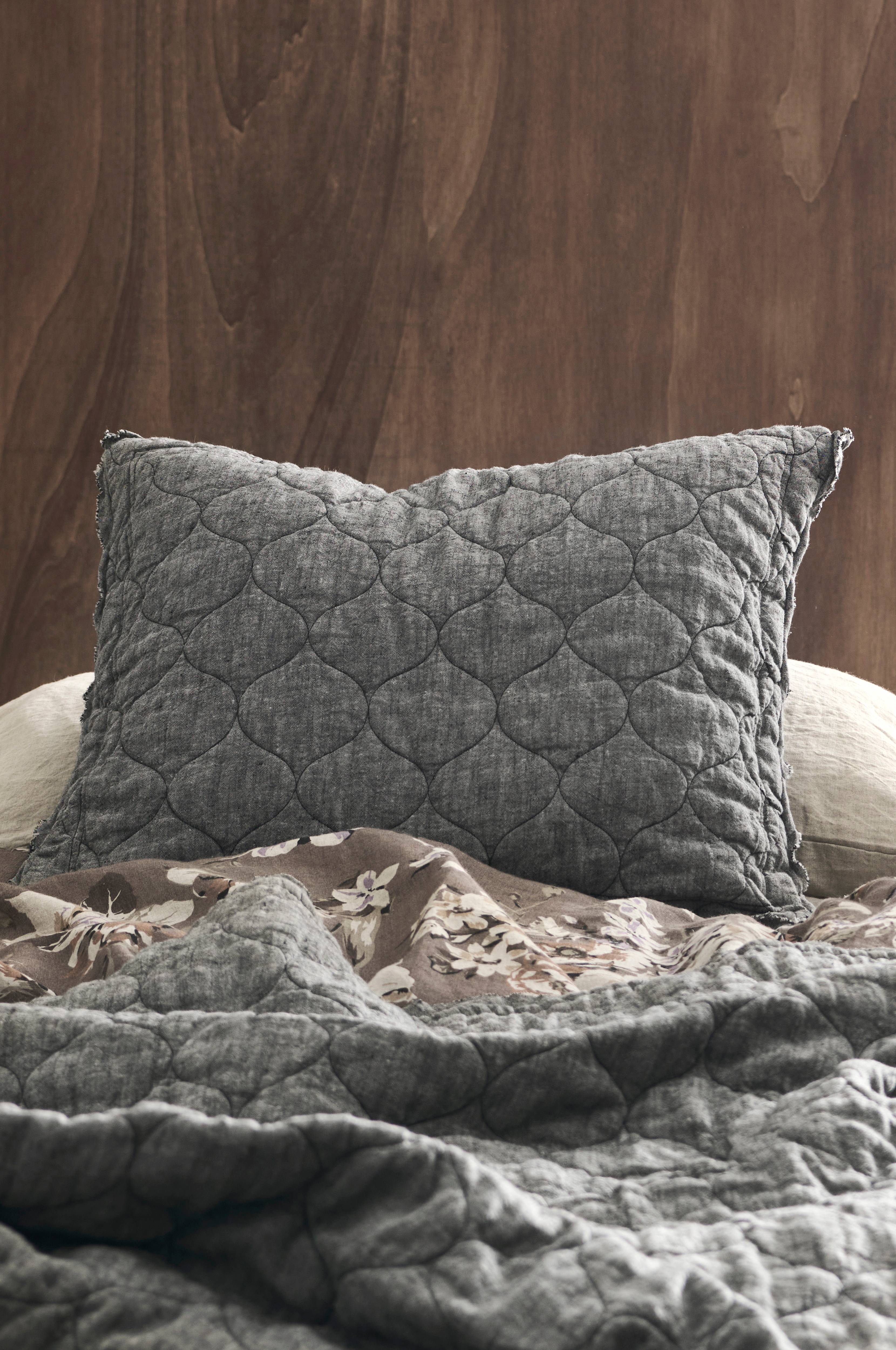 Pudebetræk i vasket og garnfarvet chambray af hør. Quiltet mønster, rå kant og vattering af 100% polyester. Bagside af ensfarvet bomuld. Str. 50x60 cm.