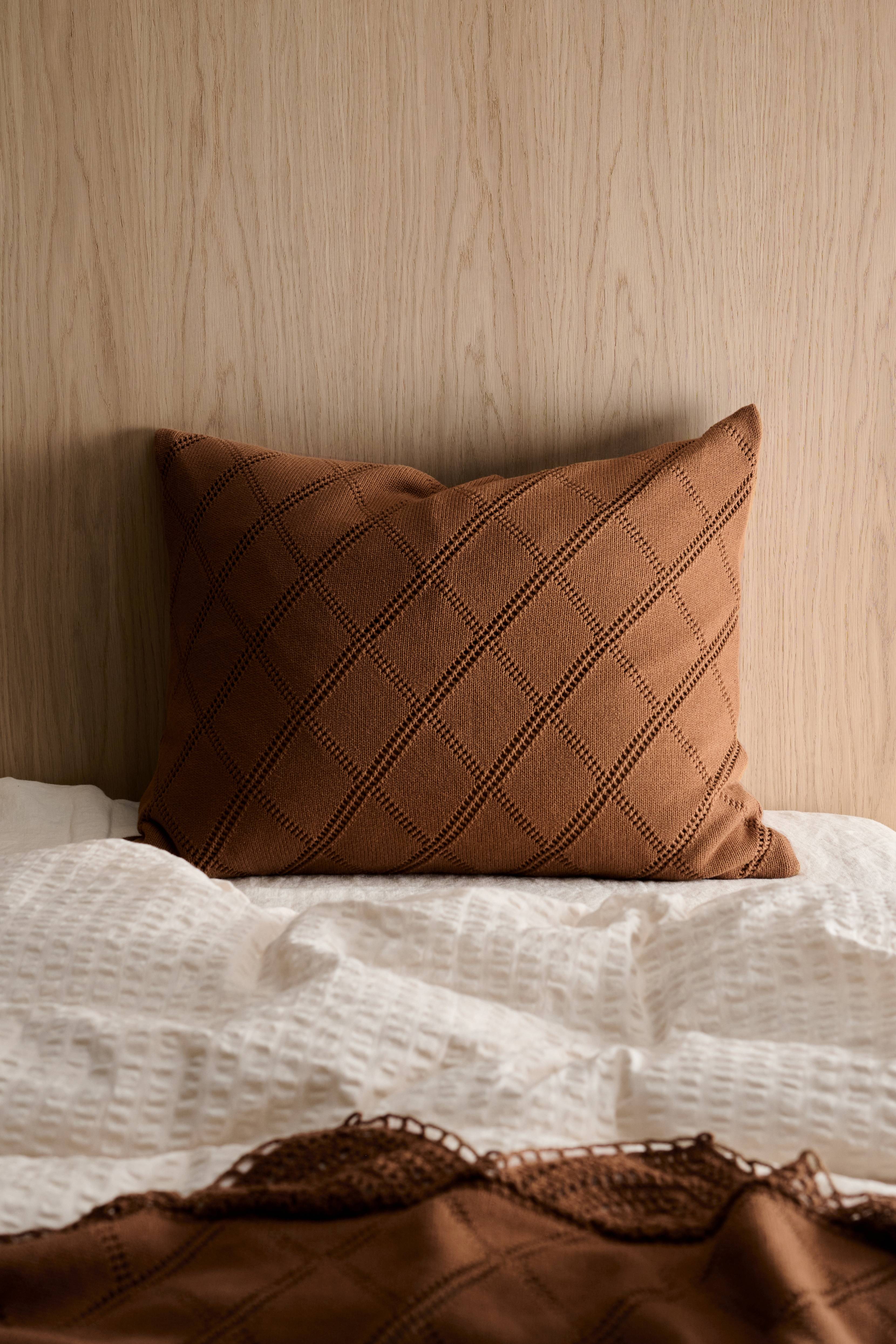 Strikket pudebetræk i vasket bomuldskvalitet med broderet mønster. Lynlås. Str. 50x60 cm.