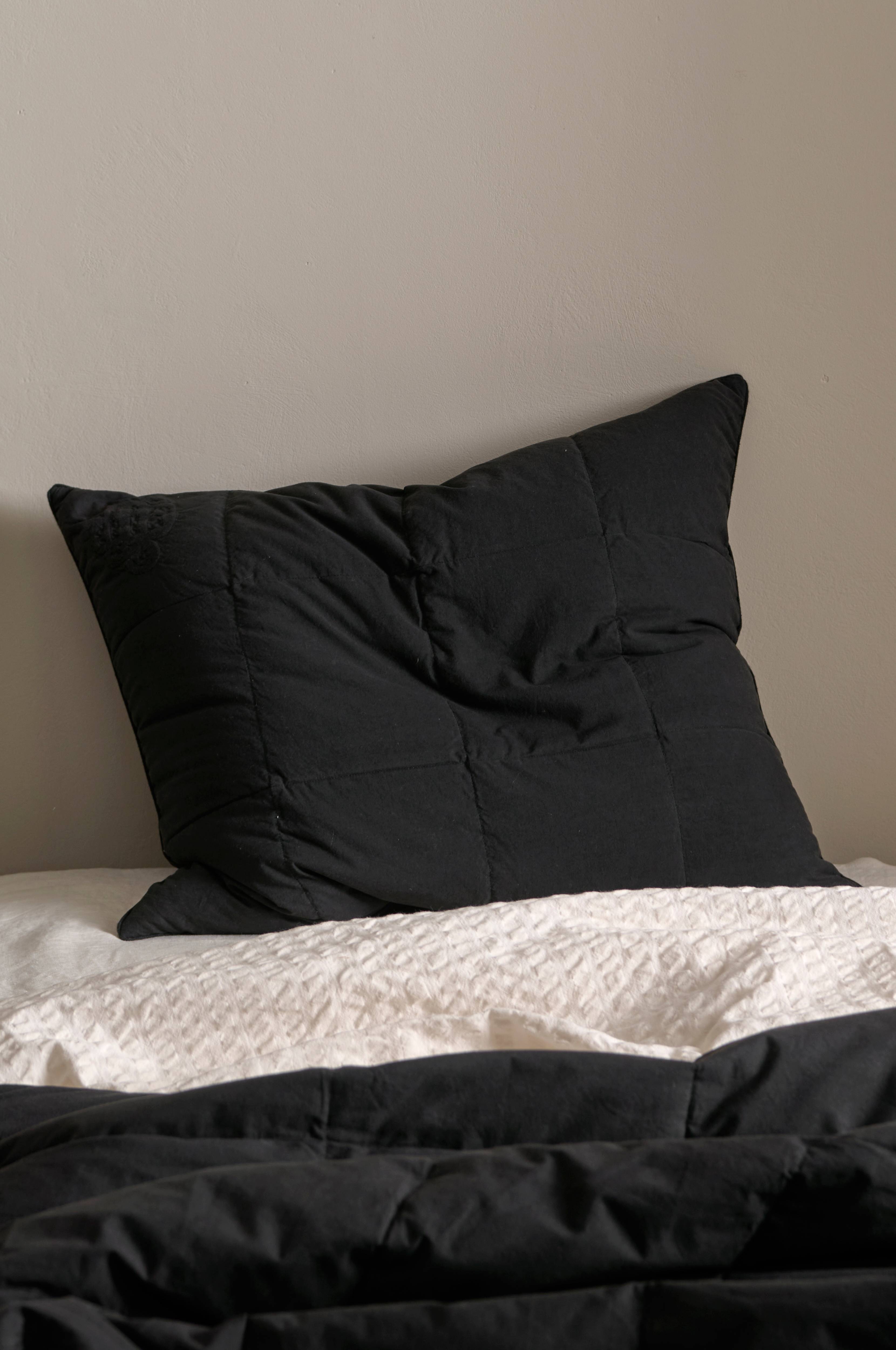 Quiltet pudebetræk med stof af bomuldspercale og fyld af 70% genindvundet dun og 30% genindvundne fjer. Broderi tone-i-tone og paspoleret kant rundt om. Trådtæthed 233 tc. Leveres pakket i en eksklusiv stofpose med broderi. Str. 50x60 cm.