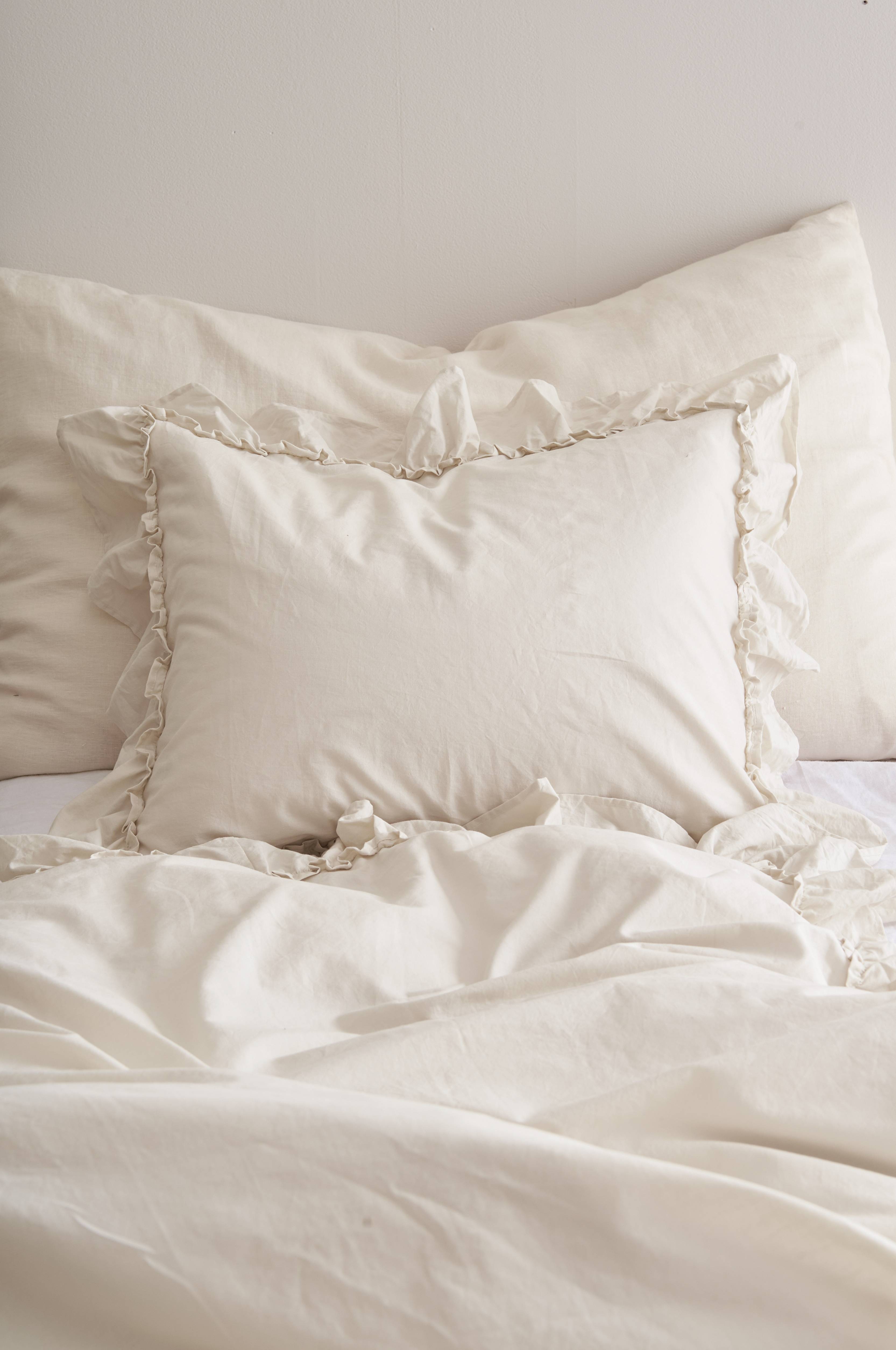Pudebetræk i skøn kvalitet af blødvasket, økologisk bomuld. Trådtæthed 144 tc. 13 cm rynket flæse hele vejen rundt. Str. pudebetræk 50x60 cm.
