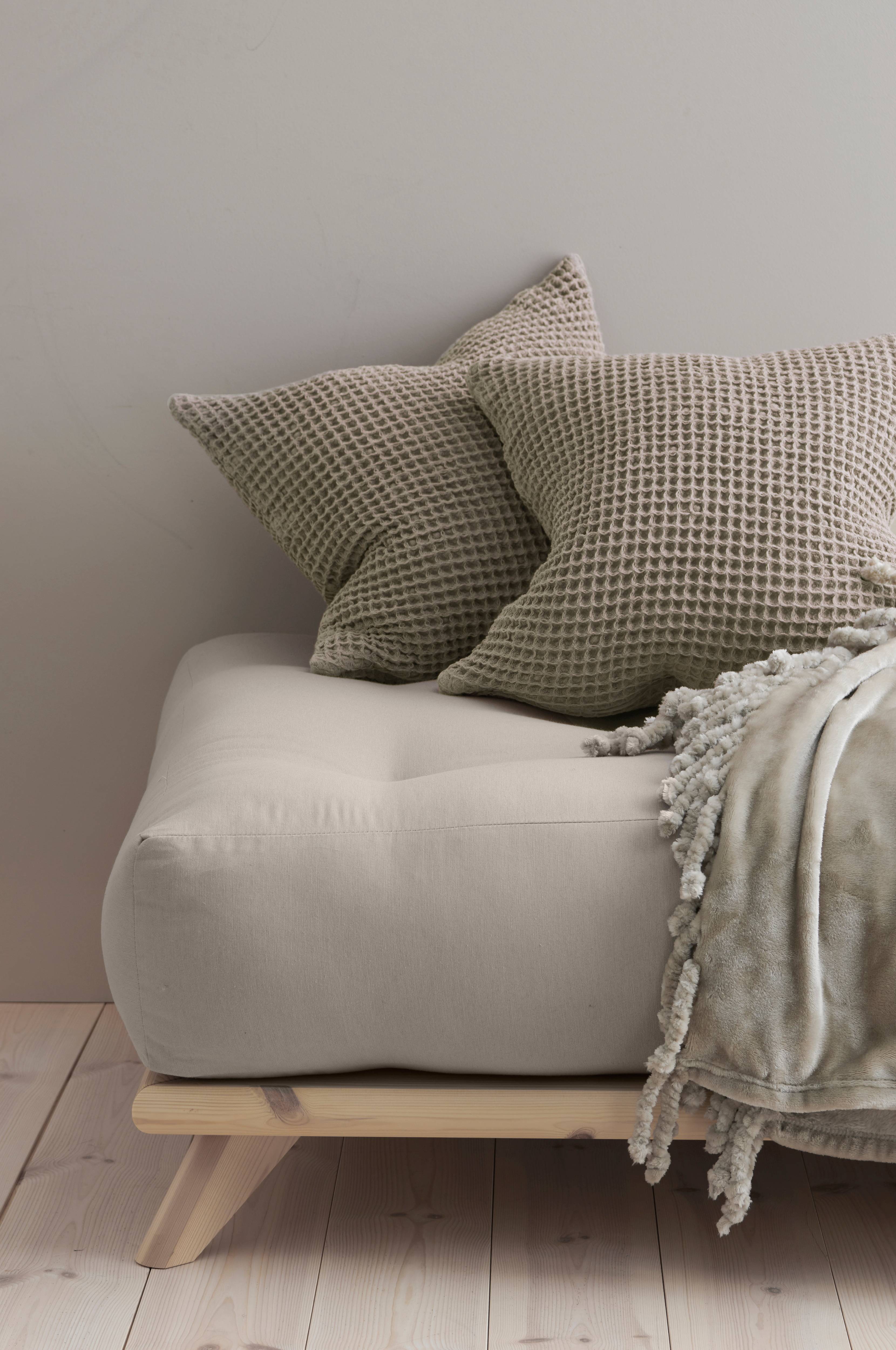 En sindssyg flot vaflet pude i en naturfarve der matcher grøn på en flatterende måde.