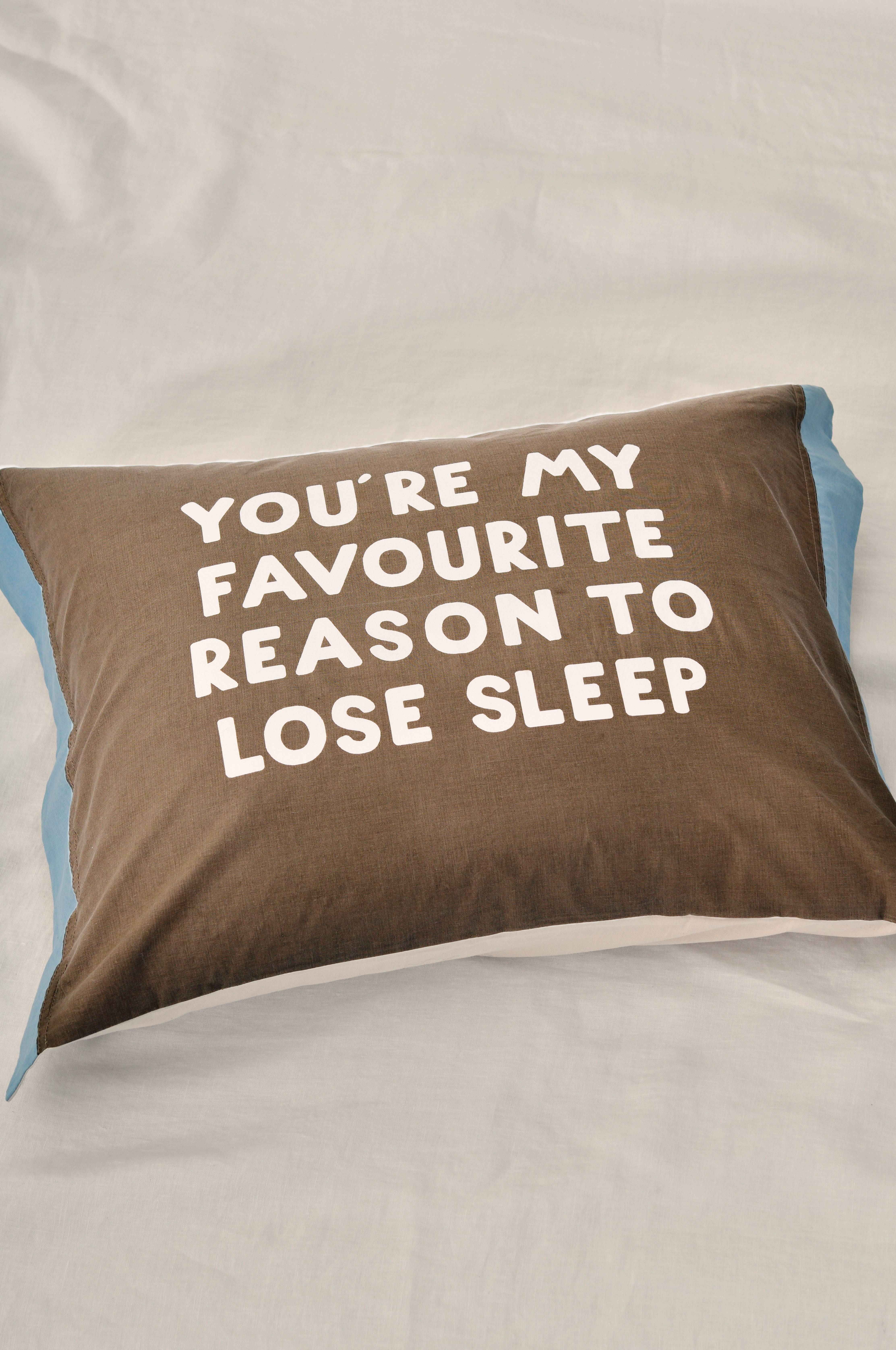 Pudebetræk i økologisk, vasket bomuld med printet tekst på forsiden og ensfarvet bagside. Trådtæthed 144 TC. Dobbelte jeanssømme hele vejen rundt. 25 cm ombuk. Str. 50x60 cm + 5 cm vinge på to sider.