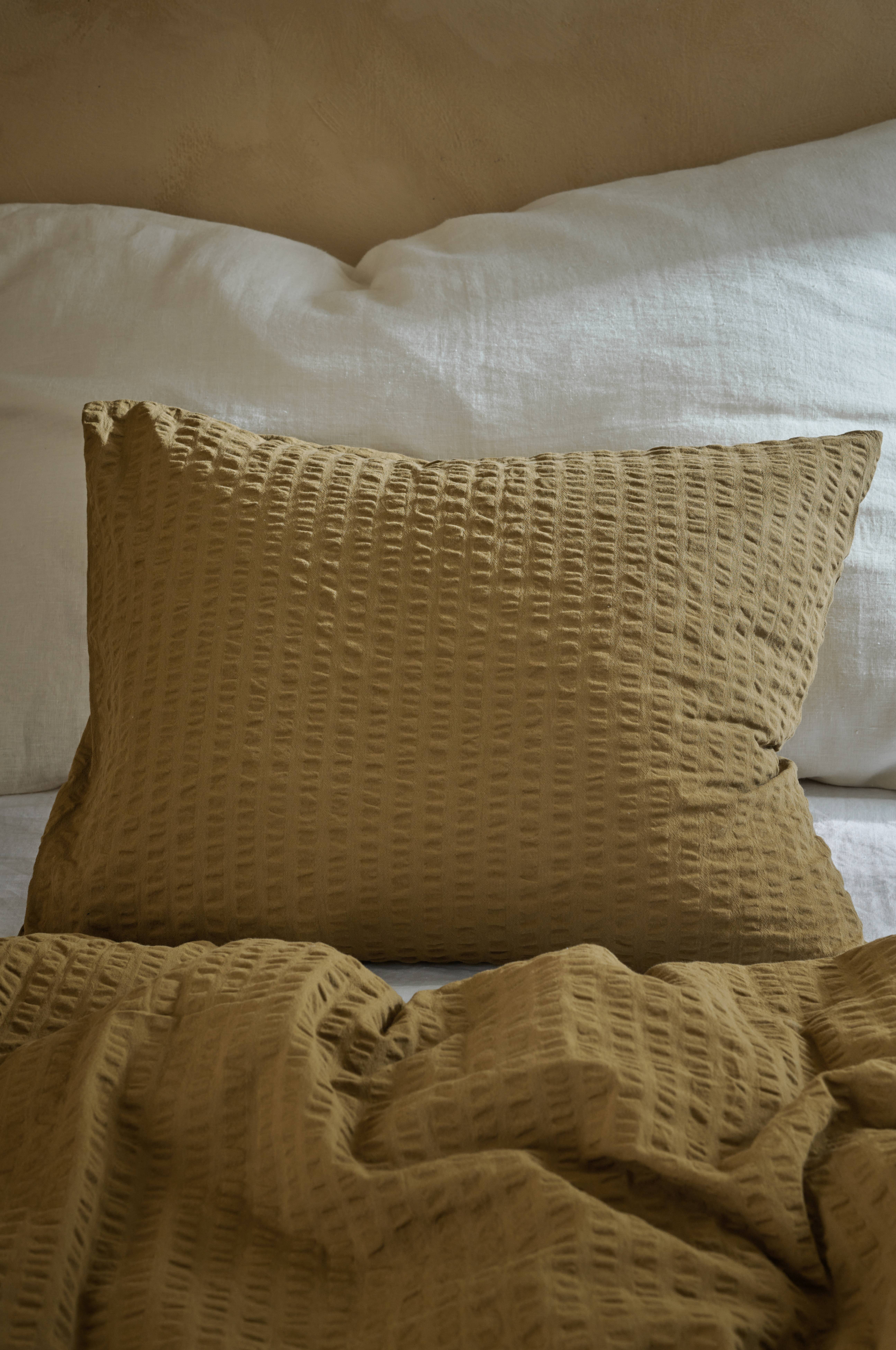 Pudebetræk i bæk og bølge (seersucker) af kæmmet, økologisk bomuld. Leveres i stofpose i samme kvalitet. Str. 50x60 cm.