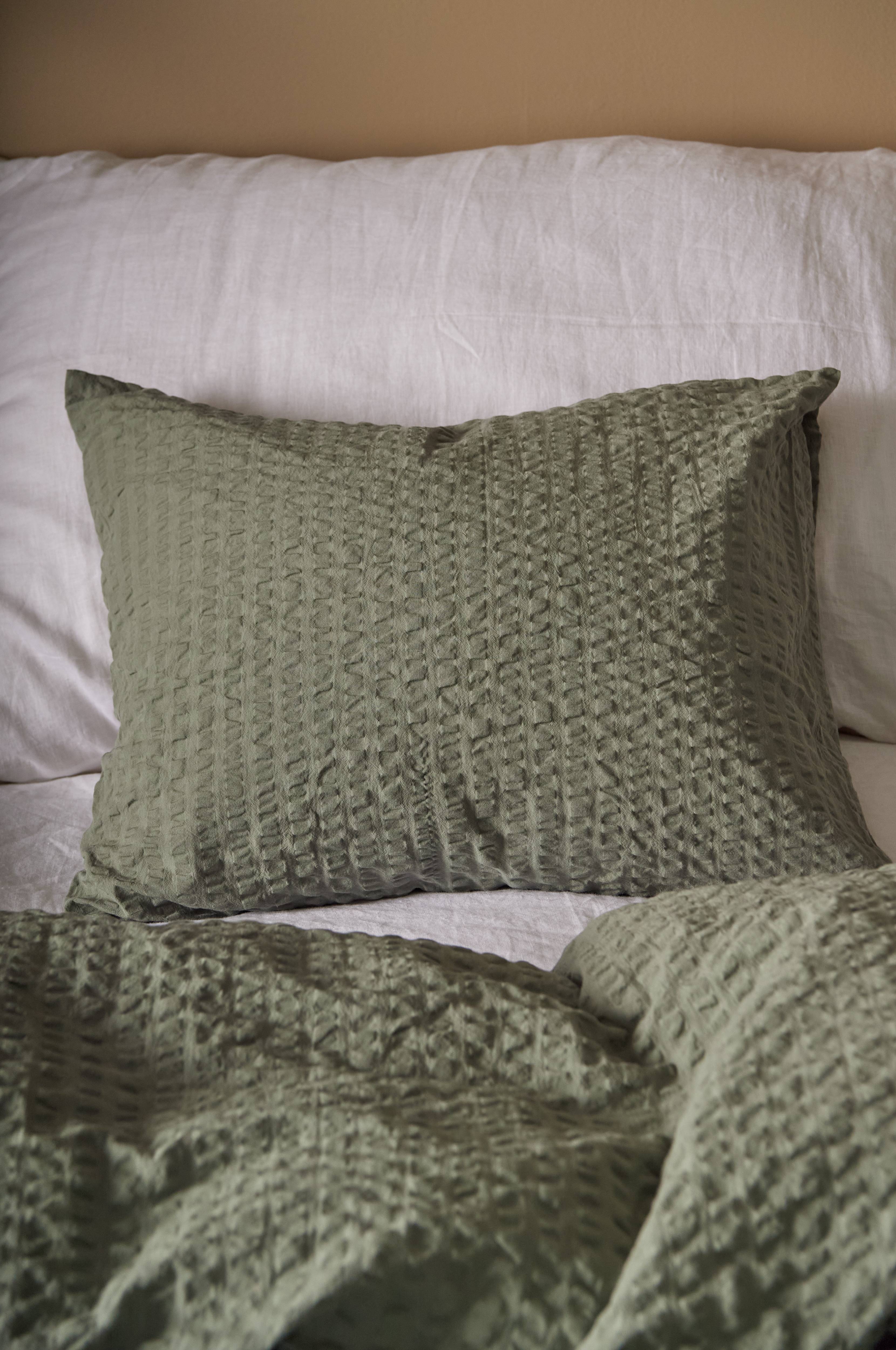 Pudebetræk i bæk og bølge (seersucker) af kæmmet, økologisk bomuld. Leveres i stofpose i samme kvalitet. Str. 50x60 cm.