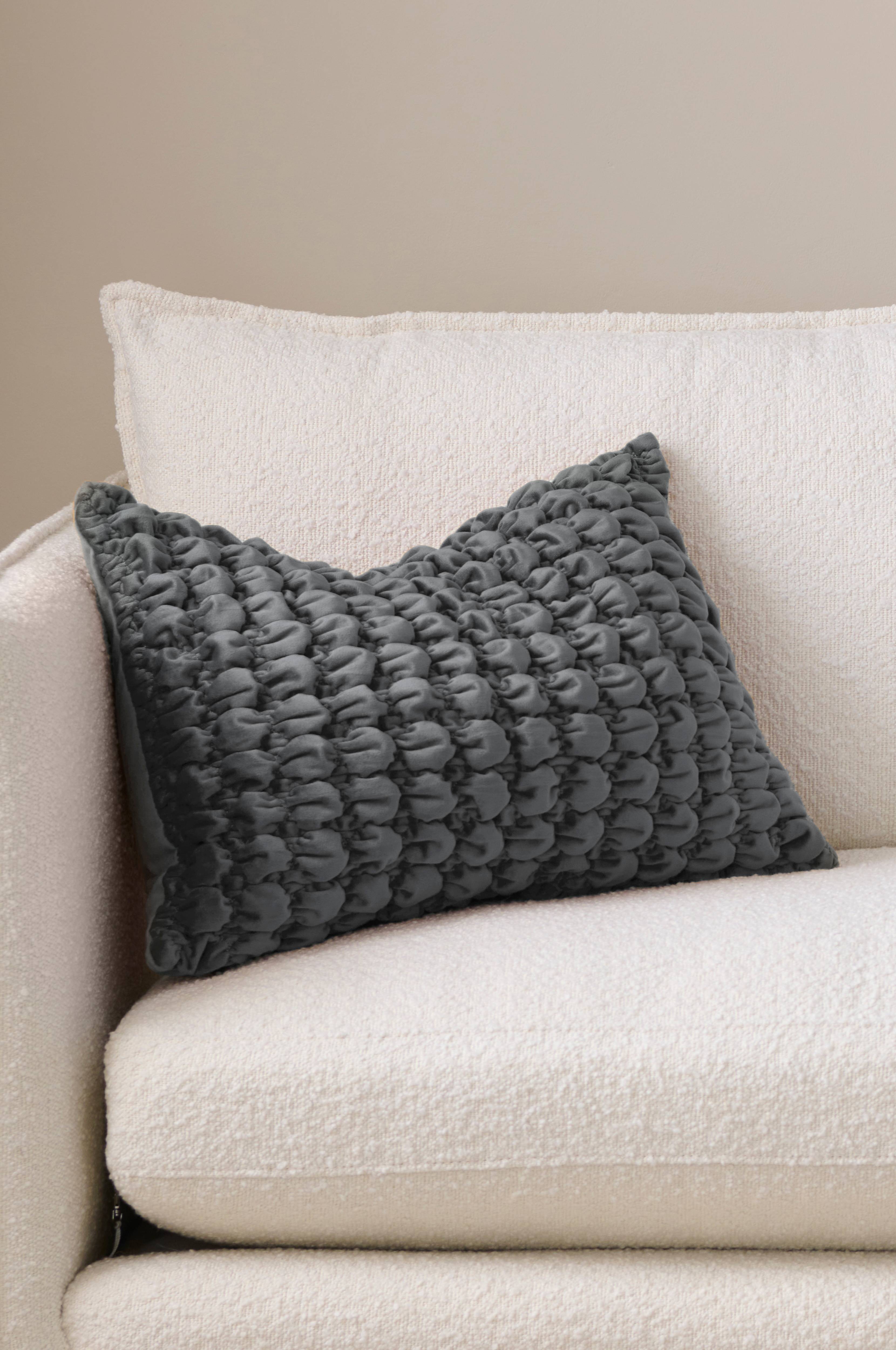 Pudebetræk af velour med fin glans og et syet, dekorativt mønster på forsiden. Glat bagside. Af genindvundet polyester. Lynlås i bunden.