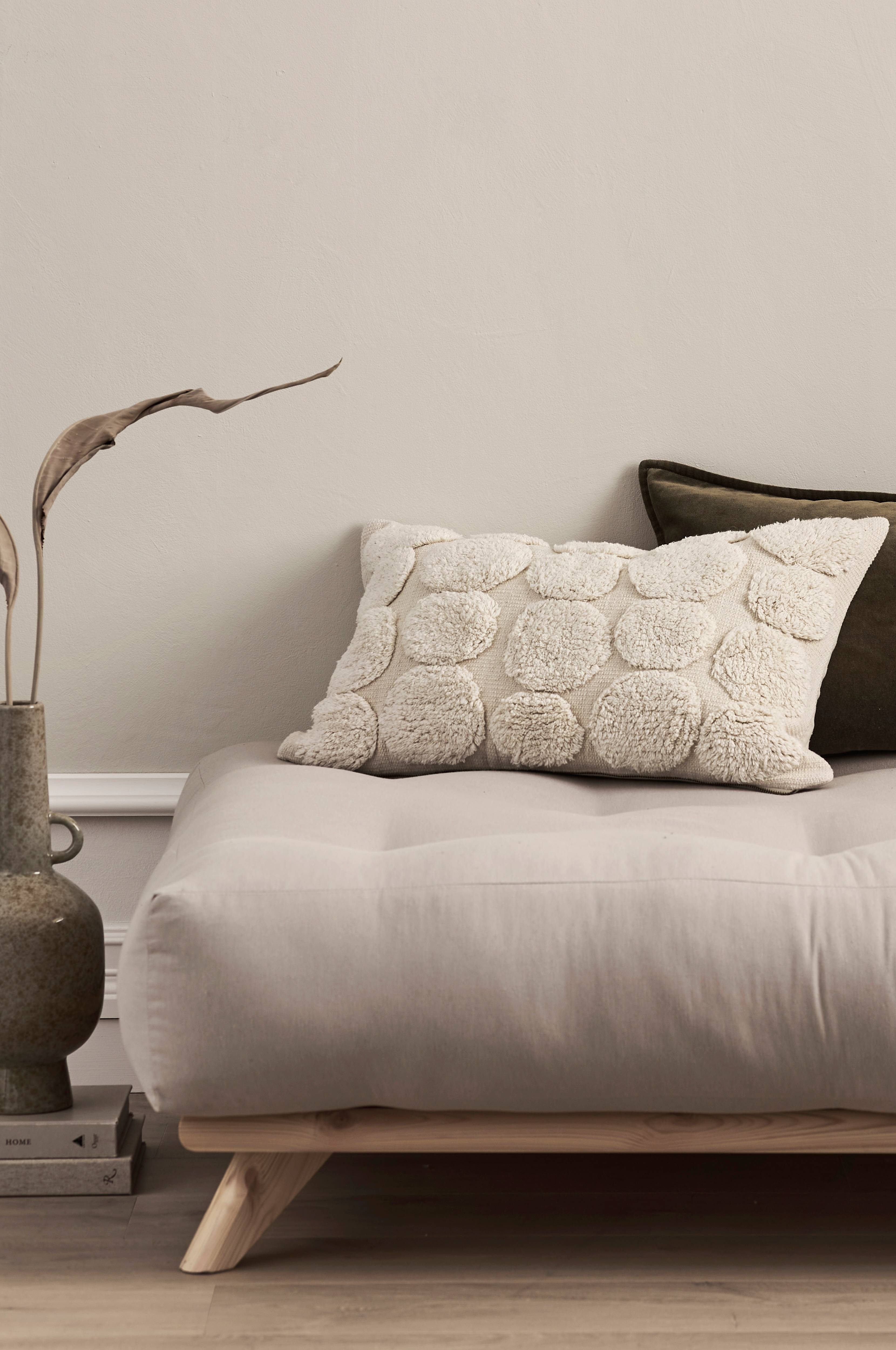 Pudebetræk i bomuld. Forsiden har et knyttet mønster på en lidt grovere, vævet kvalitet med let struktur. Ensfarvet bagside i kraftig halvpanama med frøskaller. Metallynlås i bunden.