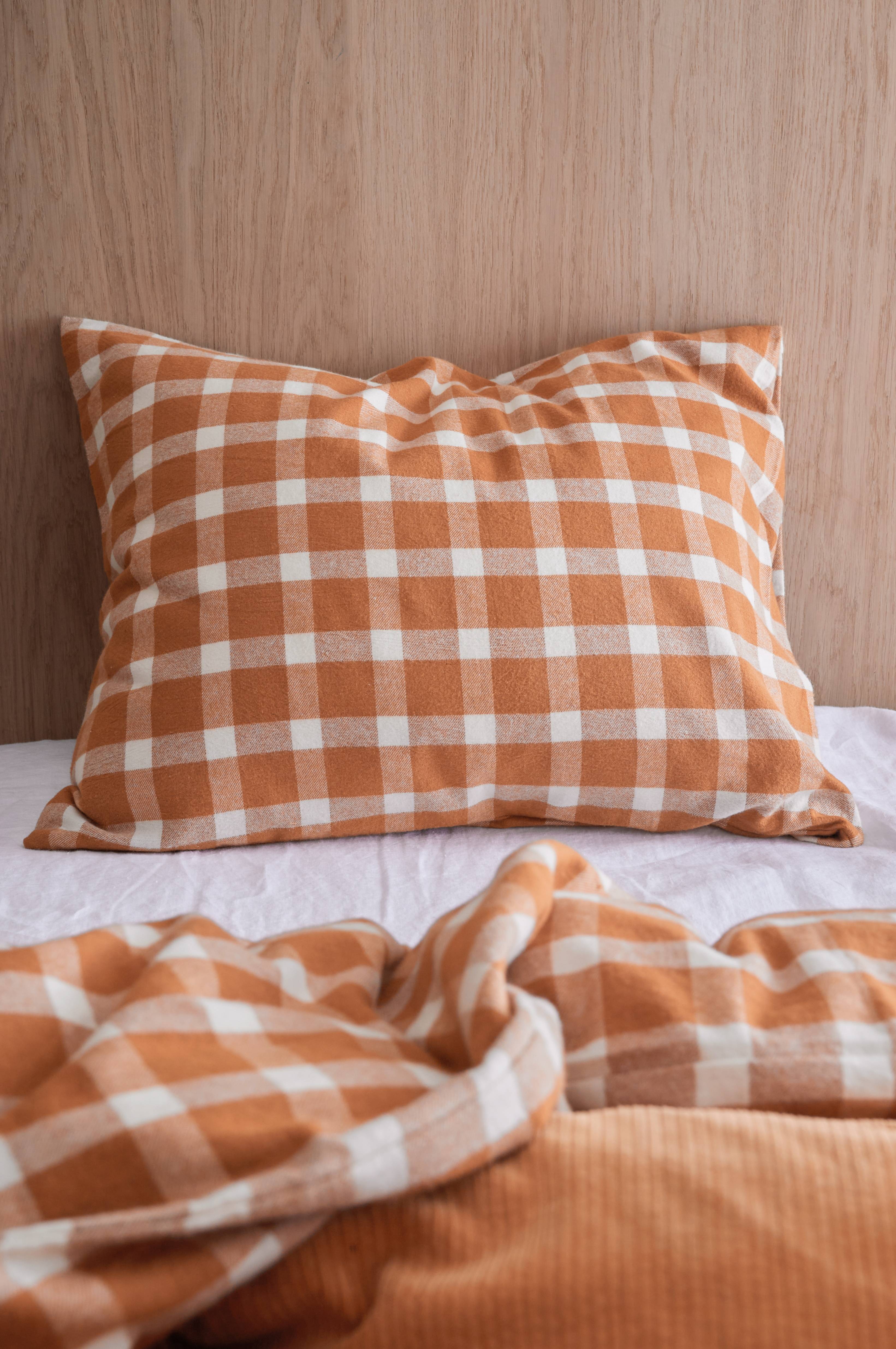 Pudebetræk i flonel af økologisk bomuld med garnfarvede tern. Vasket kvalitet med blød, børstet overflade og dobbelte jeanssømme. Trådtæthed 110 TC. Str. 50x60 cm.