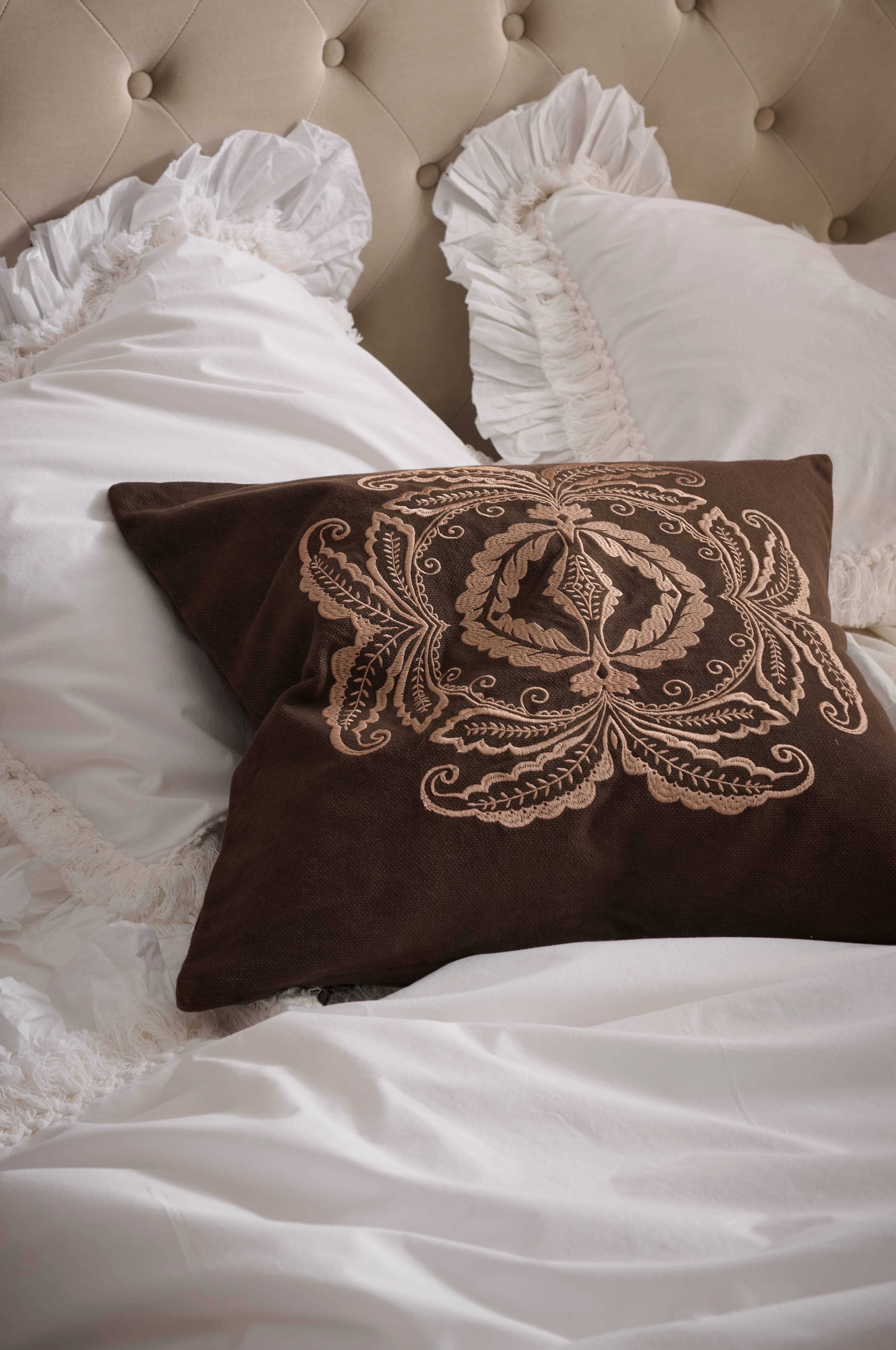 Pudebetræk i bomuld med grov struktur. Broderet mønster på forsiden. Etiket på bagsiden og metallynlås i bunden.