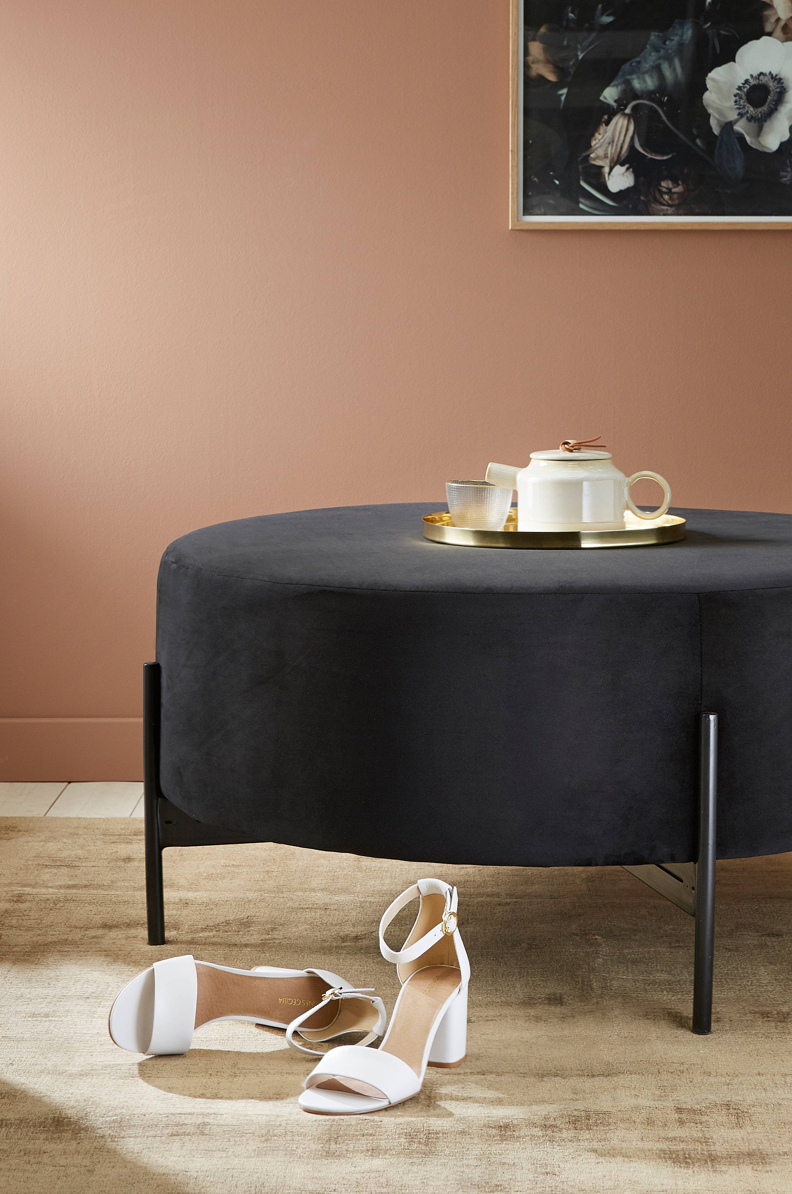 Stor siddepuf i moderne design med betræk i velour. Stel og ben af mat metal. Fyld af polyuretanskum. Højde 46 cm, Ø 100 cm.