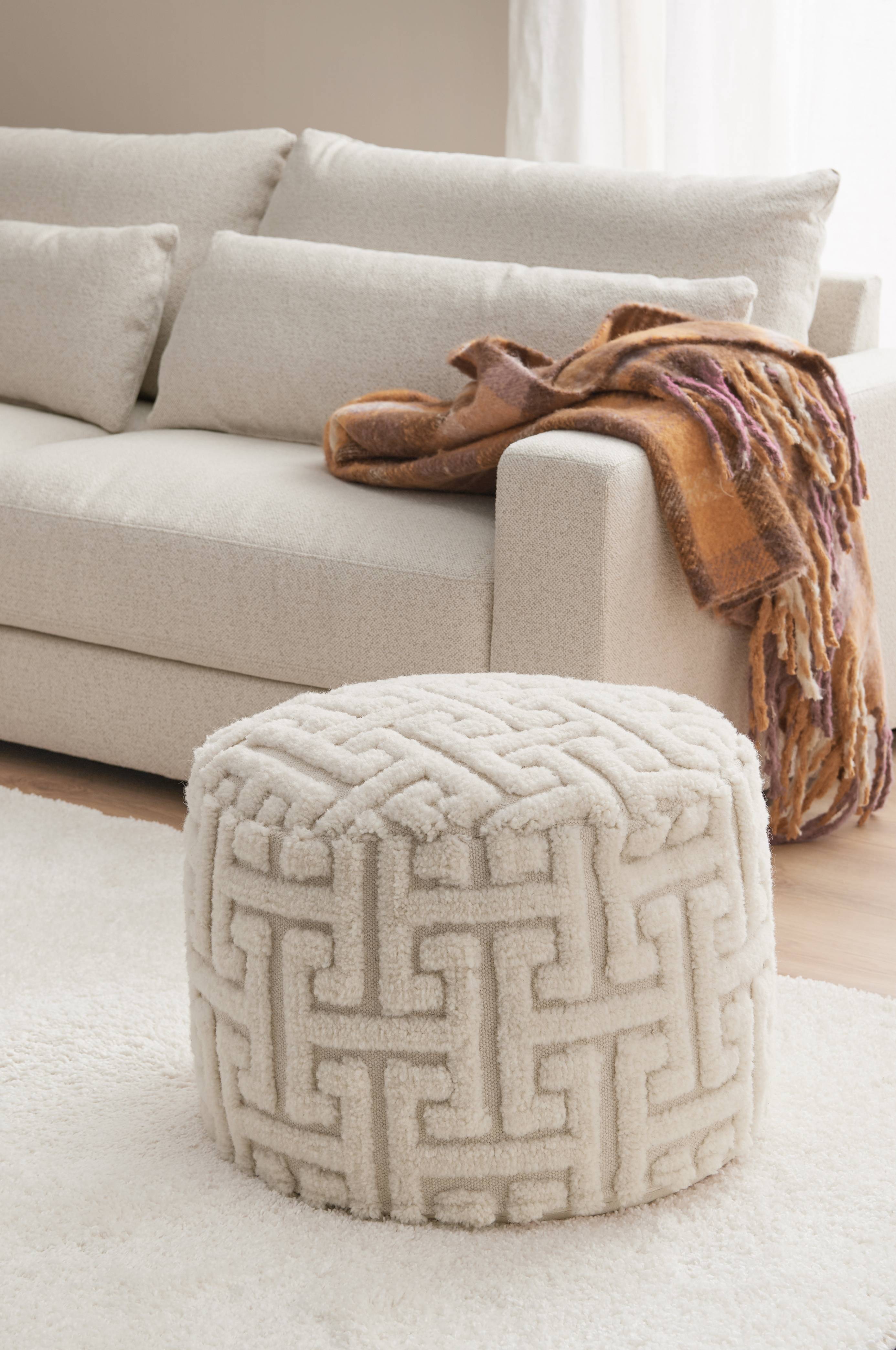 Puf i kraftig bomuldskvalitet med tuftet mønster i uld. Fyld af plastkugler (thermocol).Rengøring: Kun pletfjernelse.