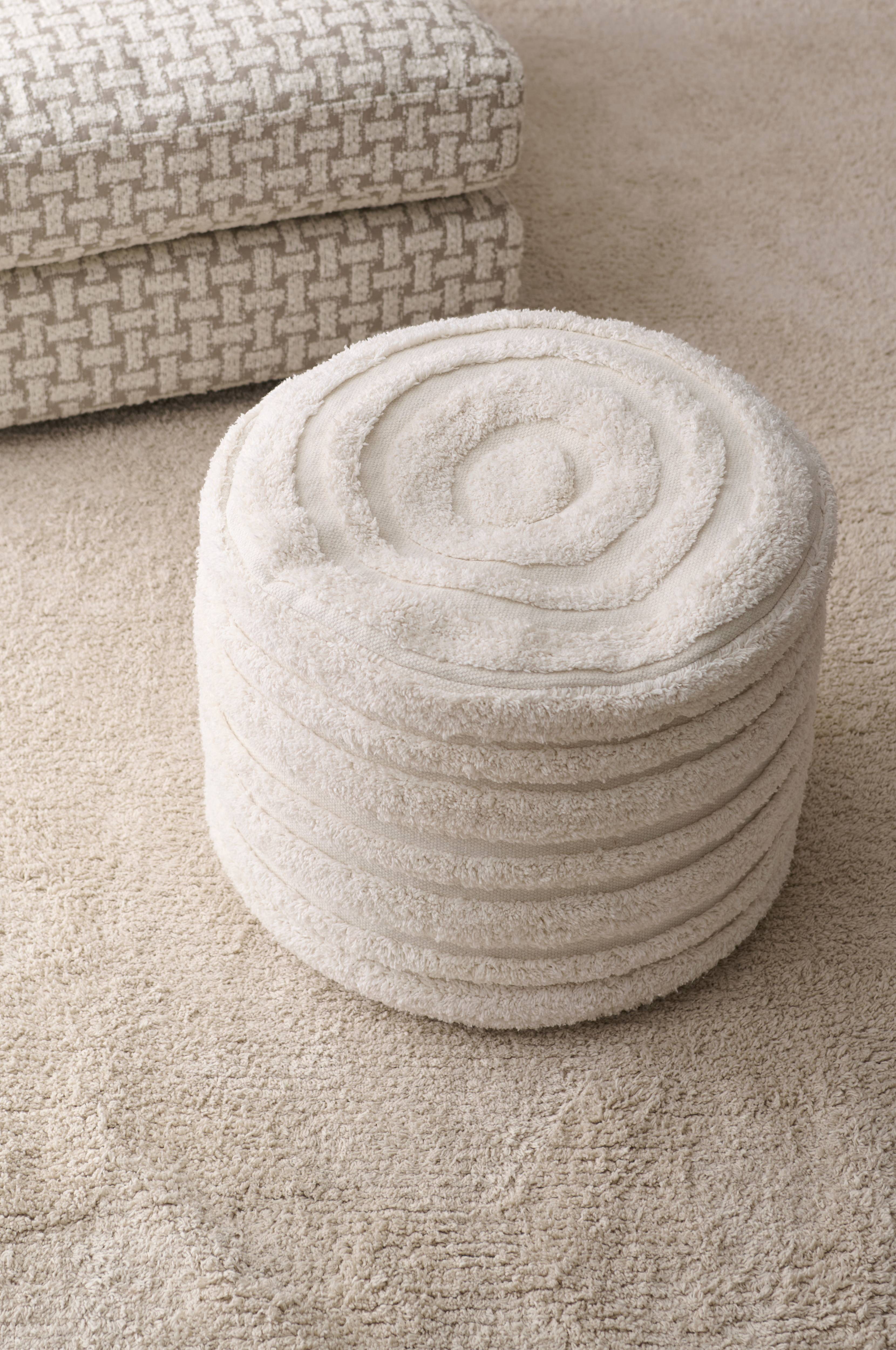 Puf med betræk i 100% bomuld med tuftet mønster. Betrækket er aftageligt og kan håndvaskes (ikke maskinvask). Fyld af plastkugler (thermocol).