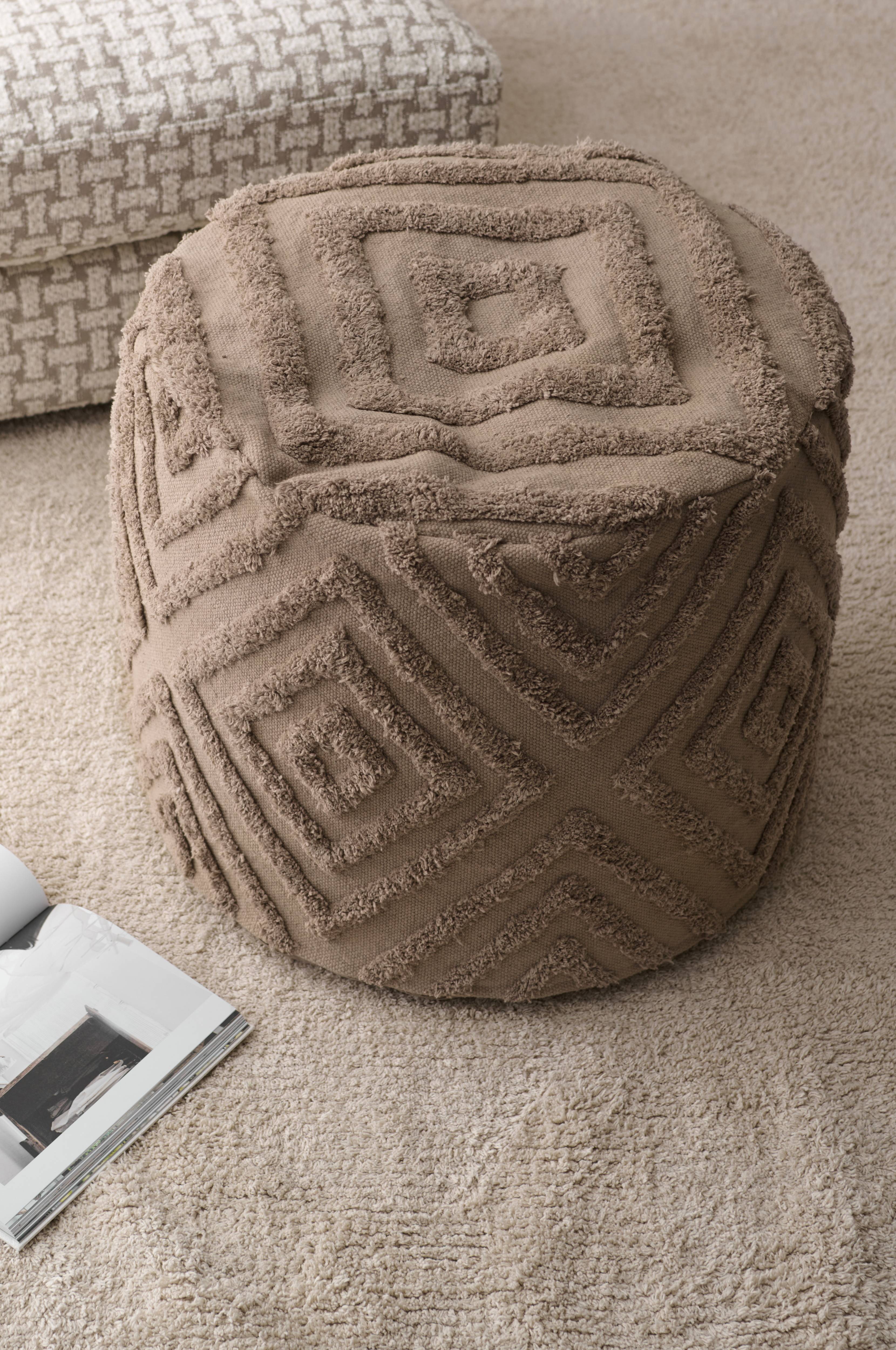 En smuk puff som pynter en lille stue sammen med et lyst gulvtæppe giver det en illusion af en større stue.