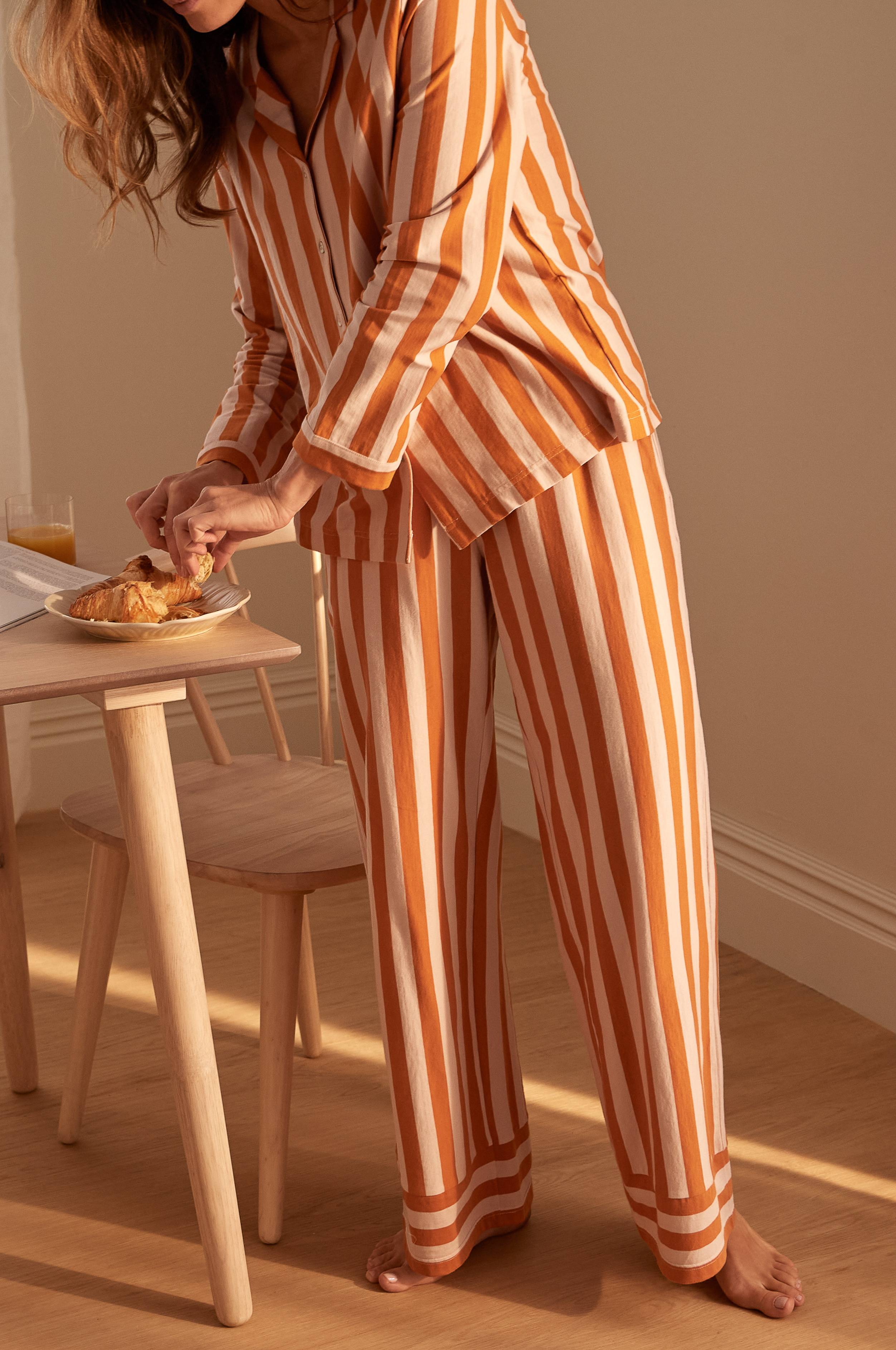 Pyjamasbukser i blød stretchjersey af økologisk bomuld i kraftig kvalitet. Lange ben med lodrette striber og vandrette striber ved benkanten. Elastiktalje og to lommer.