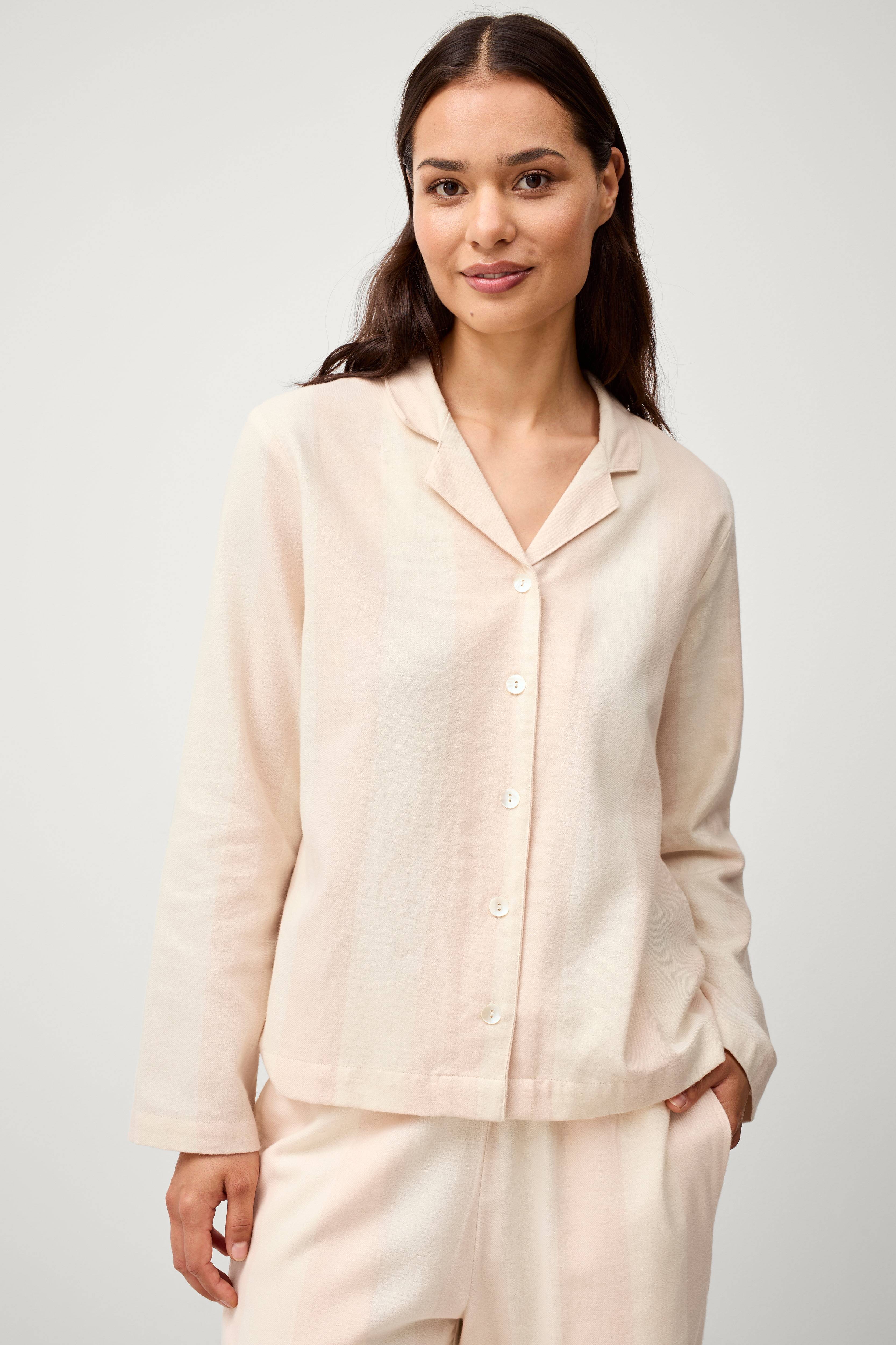 Pyjamasskjorte i økologisk bomuldsflonel med garnfarvede striber. Vasket kvalitet med blød, børstet overflade. Lige snit med lange ærmer. Krave med revers. Længde 61 cm i størrelse S.