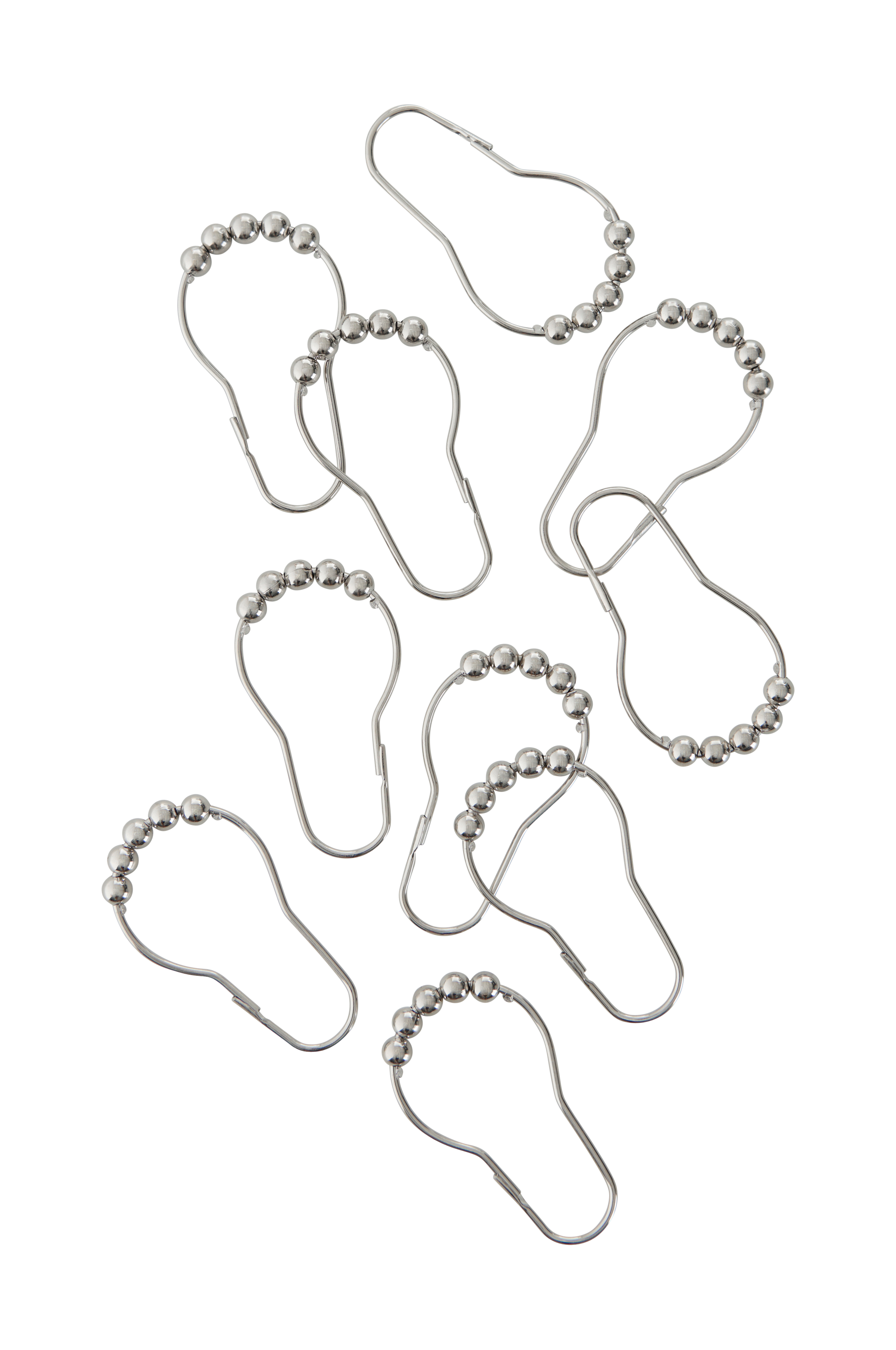 10 stk. ringe til badeforhæng. Ringene kan åbnes. Af sølvfarvet metal.