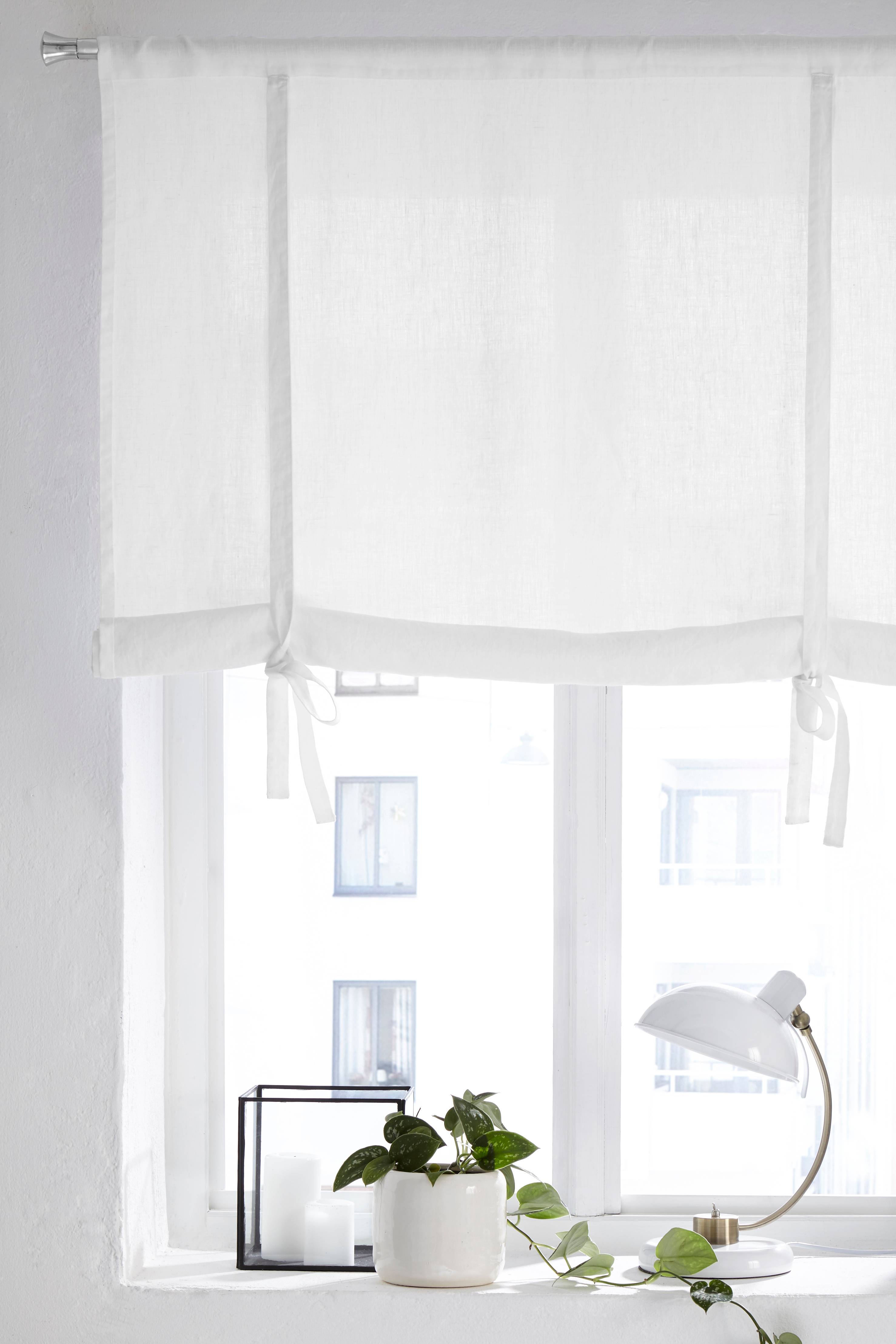 Roll up-gardin i vasket hørkvalitet med bindebånd. Af fransk hør. For at få en lige kant forneden rulles gardinet rundt om en træpind (træpinde medfølger ikke). For at bevare teksturen tørretumbles gardinet ved lav temperatur og hænges op, mens det er let fugtigt. Længde 100 cm. Findes i fire bredder: 80, 100, 120 og 140 cm.