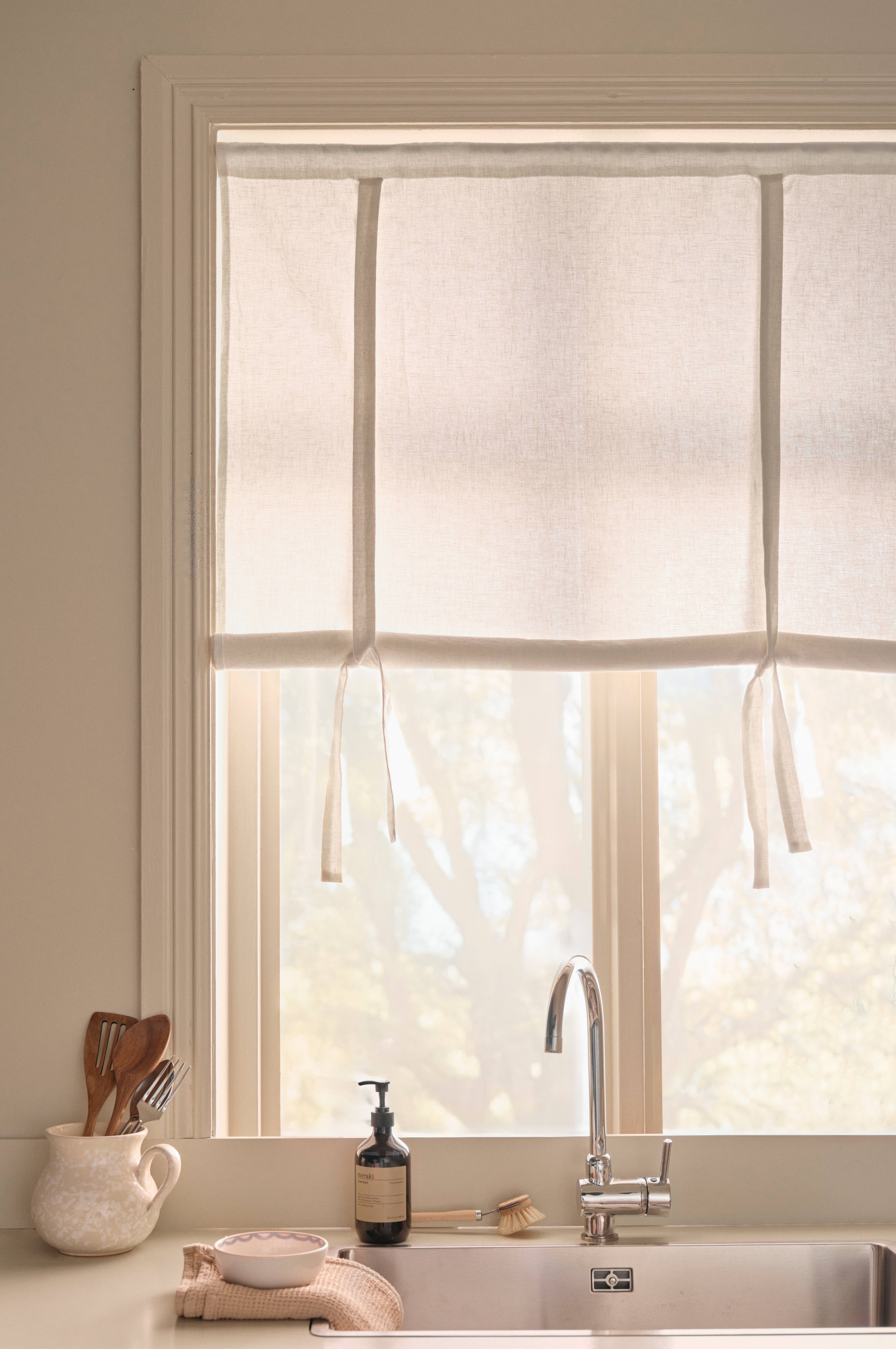• Hvis du vil have en lige kant, skal du rulle gardinet rundt om en træpind (træpind medfølger ikke).