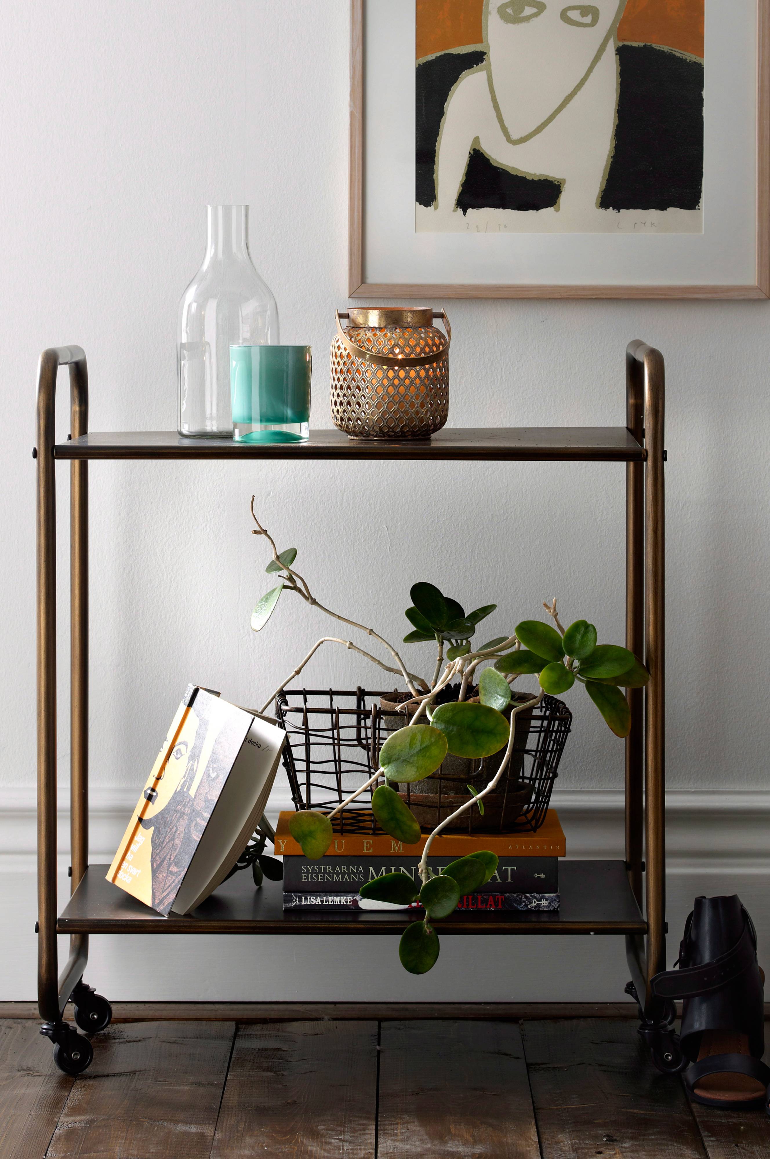 Jeg bruger hylden som et sidebord. Den er stor nok, indtil jeg kan rumme flere grønne planter såvel som forskellige andre ting. Praktisk med hjul, så det kan flyttes ved rengøring