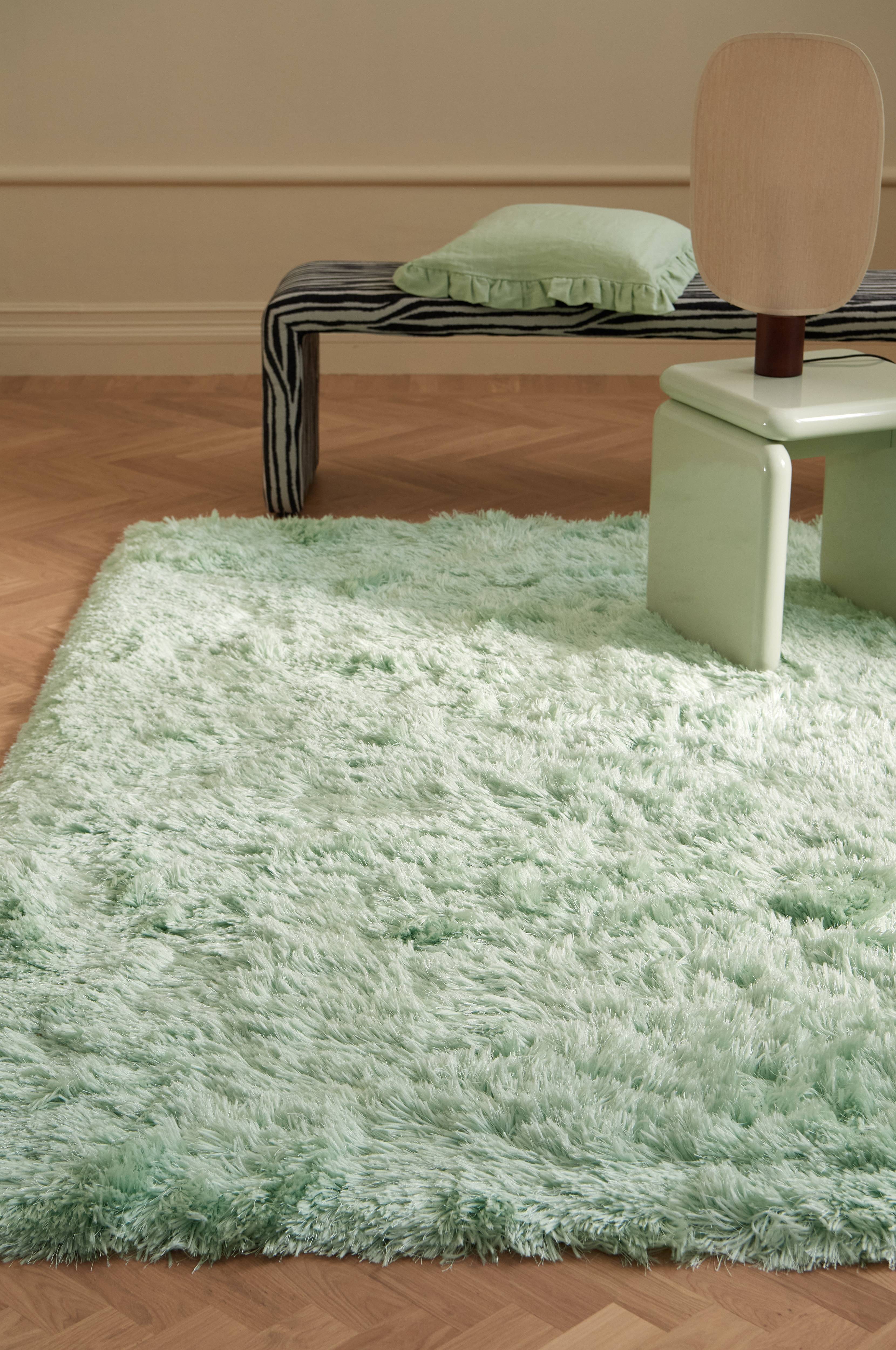 Ryatæppe med meget blød og tæt luv i to forskellige garner, en mat og en blank, som giver et levende udtryk. Luvhøjde 7 cm.