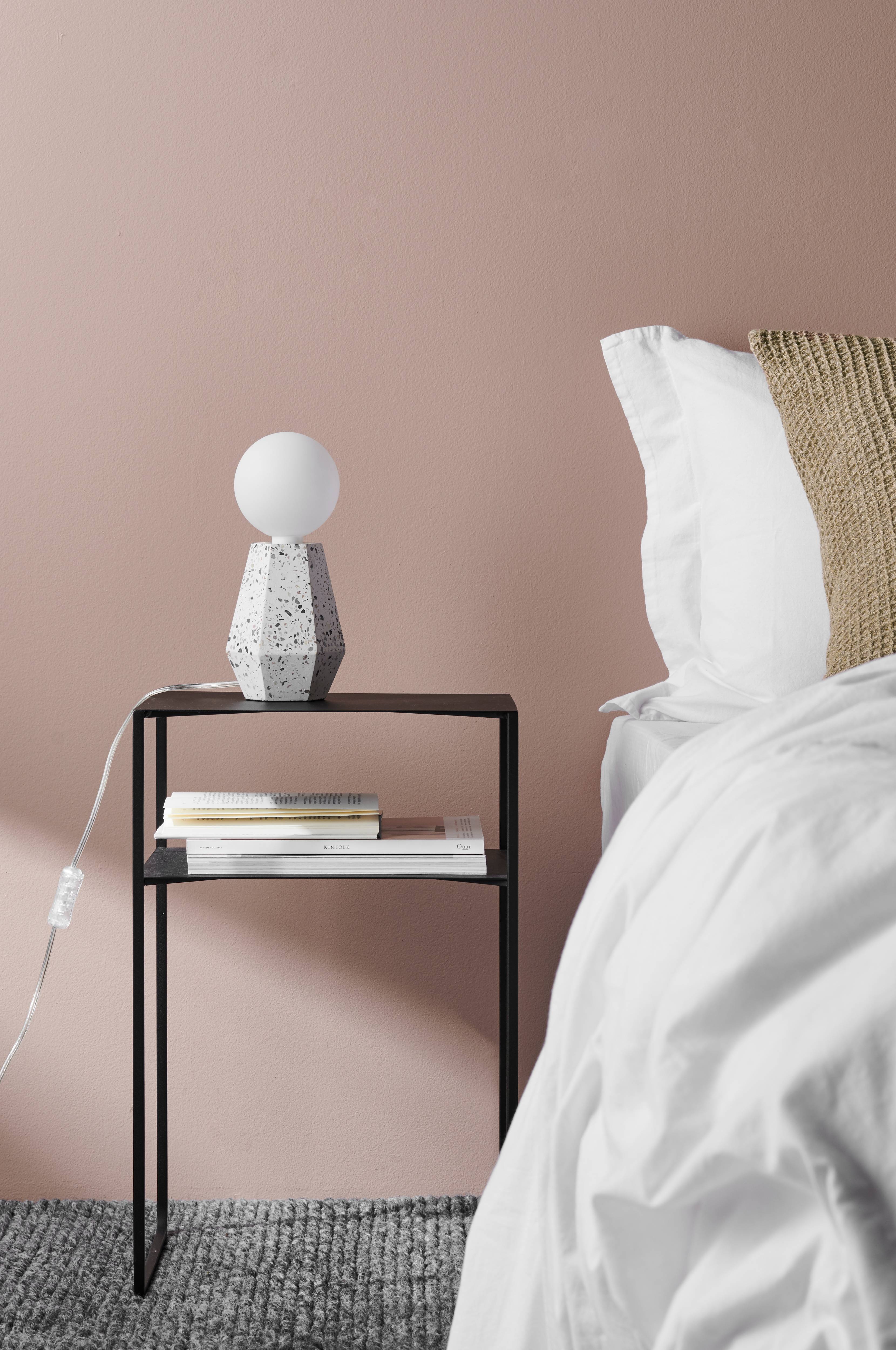 Letplaceret sengebord i pulverlakeret metal med sandet finish og let, fin struktur. To, maks. vægt pr. hylde er 10 kg. Bredde 30 cm, højde 55 cm, dybde 35 cm. Højde mellem hylderne 15 cm. Samlet.