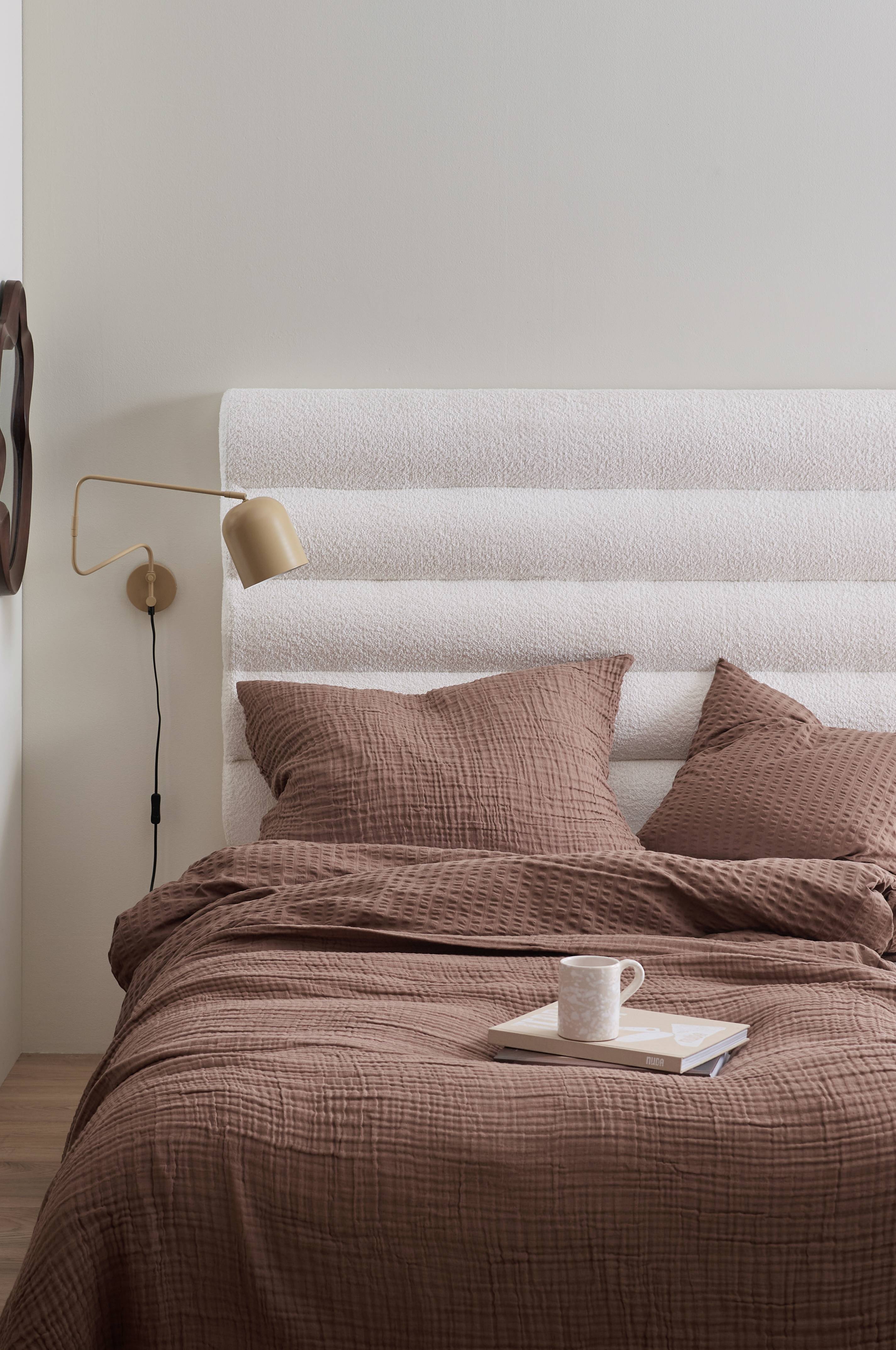 Vatteret sengegavl med ramme i massivt træ og plywood. Betræk i boucléstof af polyester med buet struktur. Fyld af polyestervat. Til vægophængning. Produktet indeholder FSC-certificeret træ, som er fældet i et ansvarsfuldt skovbrug, der tager hensyn til mennesker og miljø.