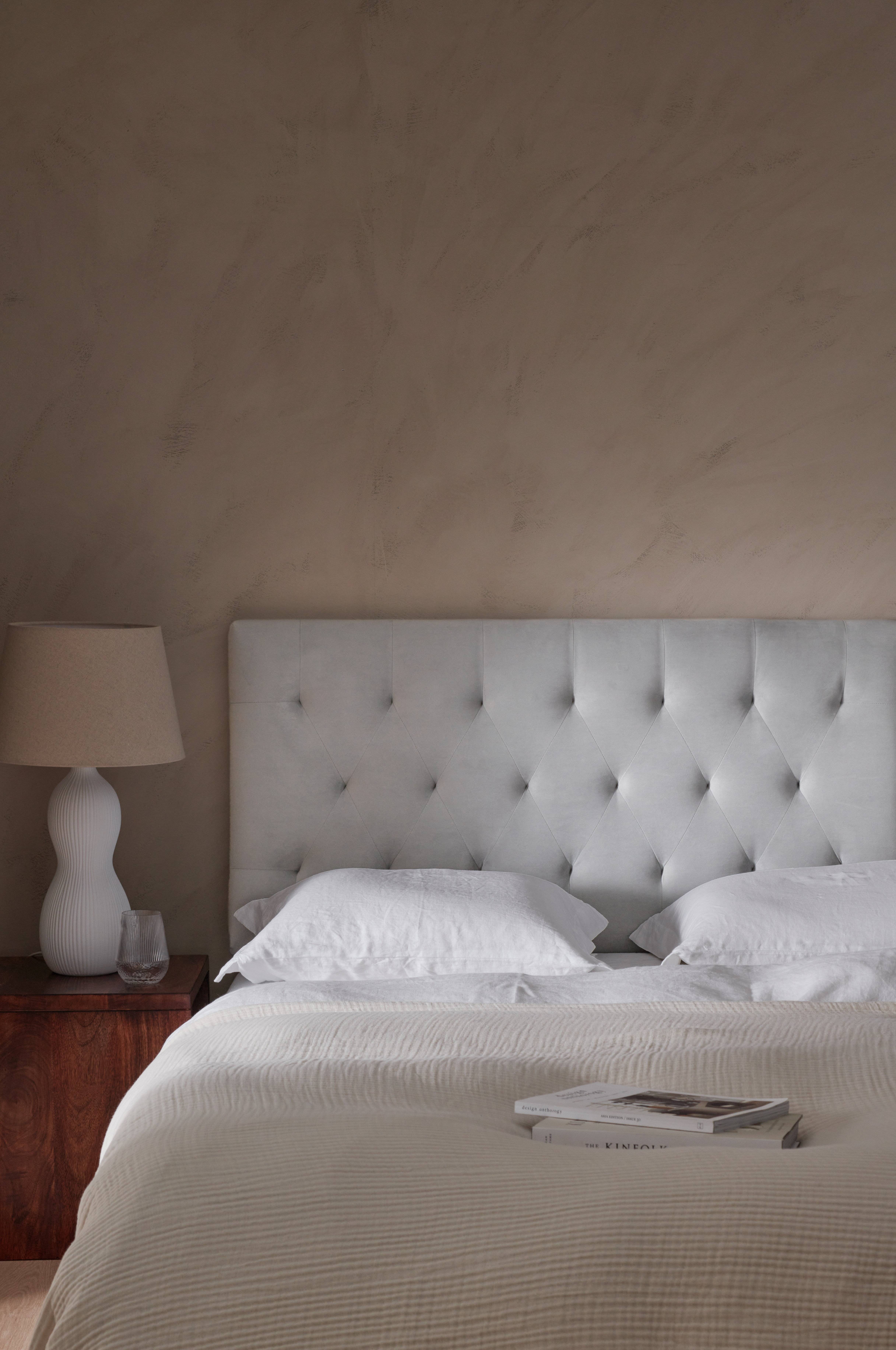 Polstret sengegavl som fastgøres på væggen (to kroge på bagsiden). Stel af fyrretræ og plywood. Betræk i velour af polyester og fyld af polyeter.