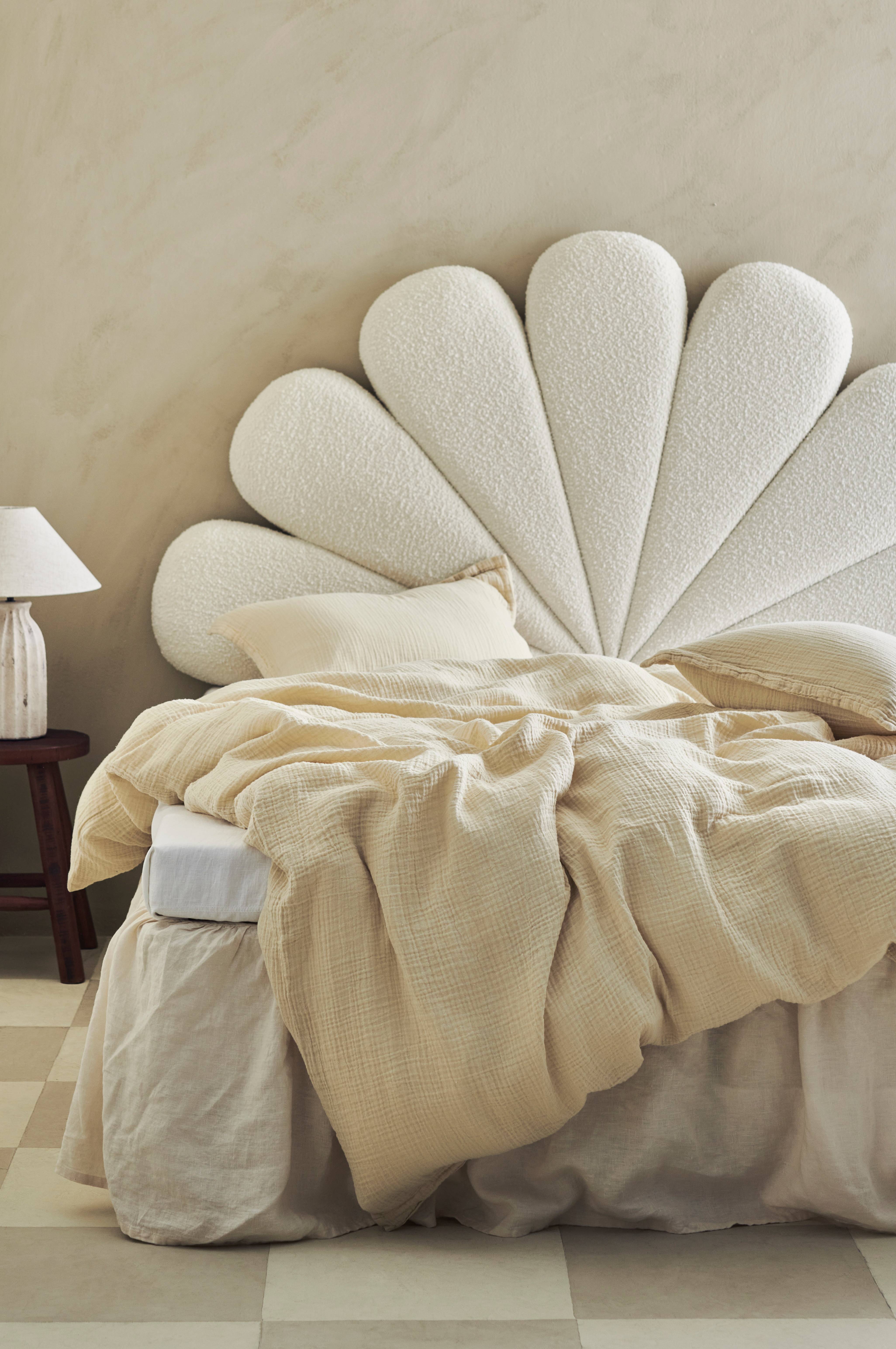 Sengegavl med ramme i massivt træ og plywood. Betræk i bouclé af polyester/akryl og fyld af polyestervat. Til vægophængning.