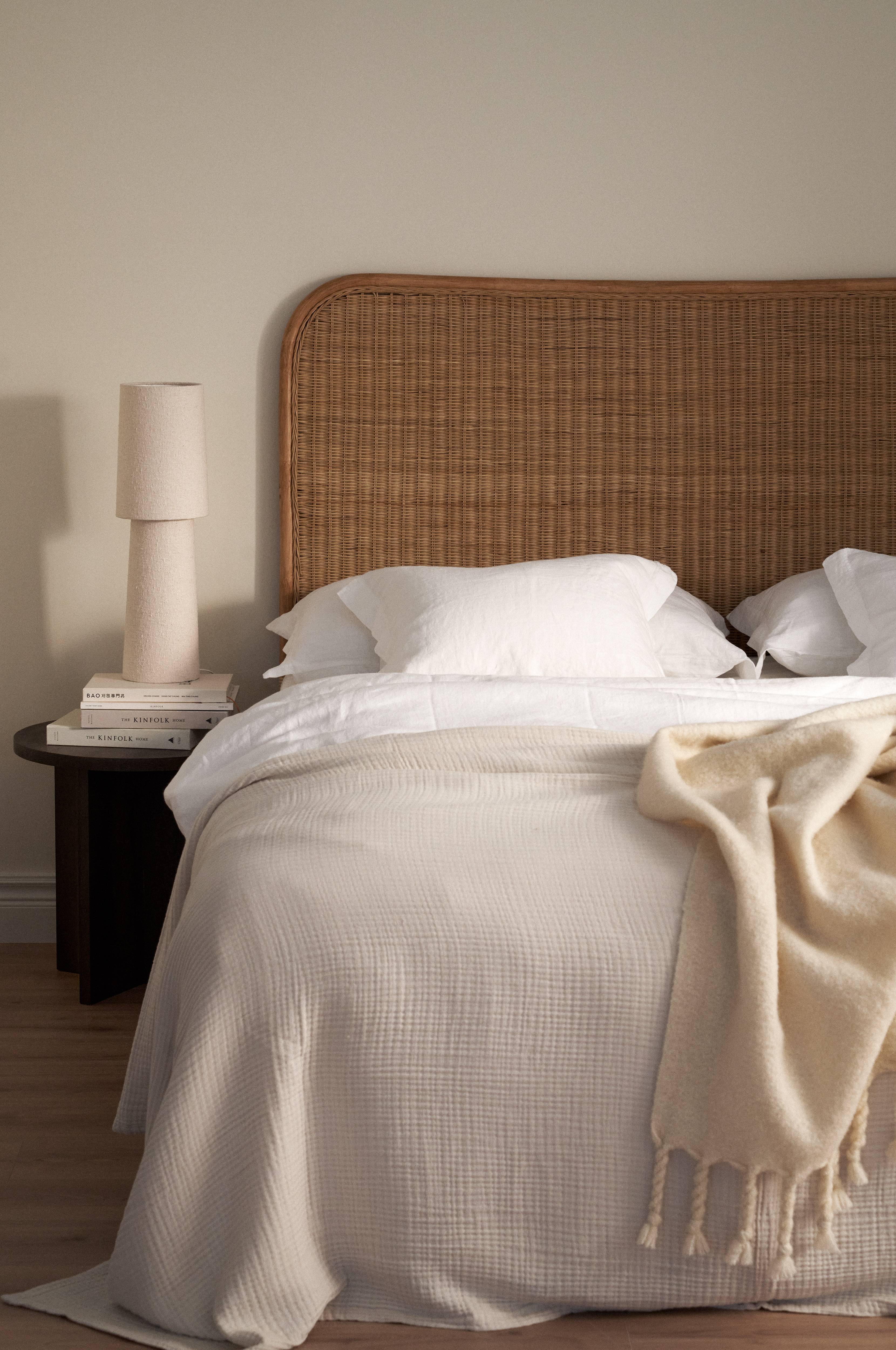 Hovedgavl i rotting med tætvævet top og dekorativ kant. Gavlen stilles på gulvet. Mål: Bredde 181 cm, højde 137 cm, dybde 4 cm.