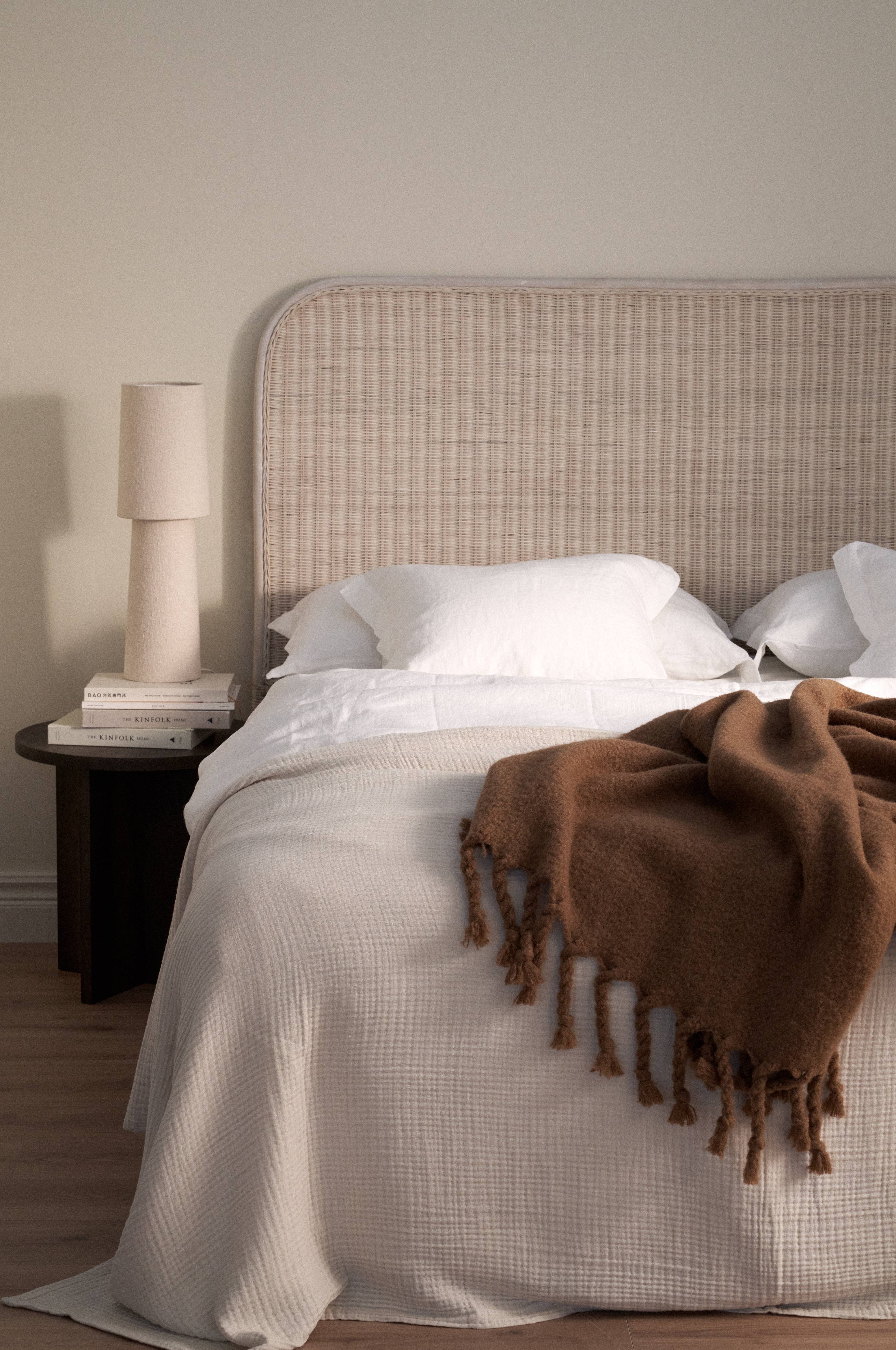 Meget flot sengegavl i rattan. Ingen montering, så det er nemt at placere bag sengen.