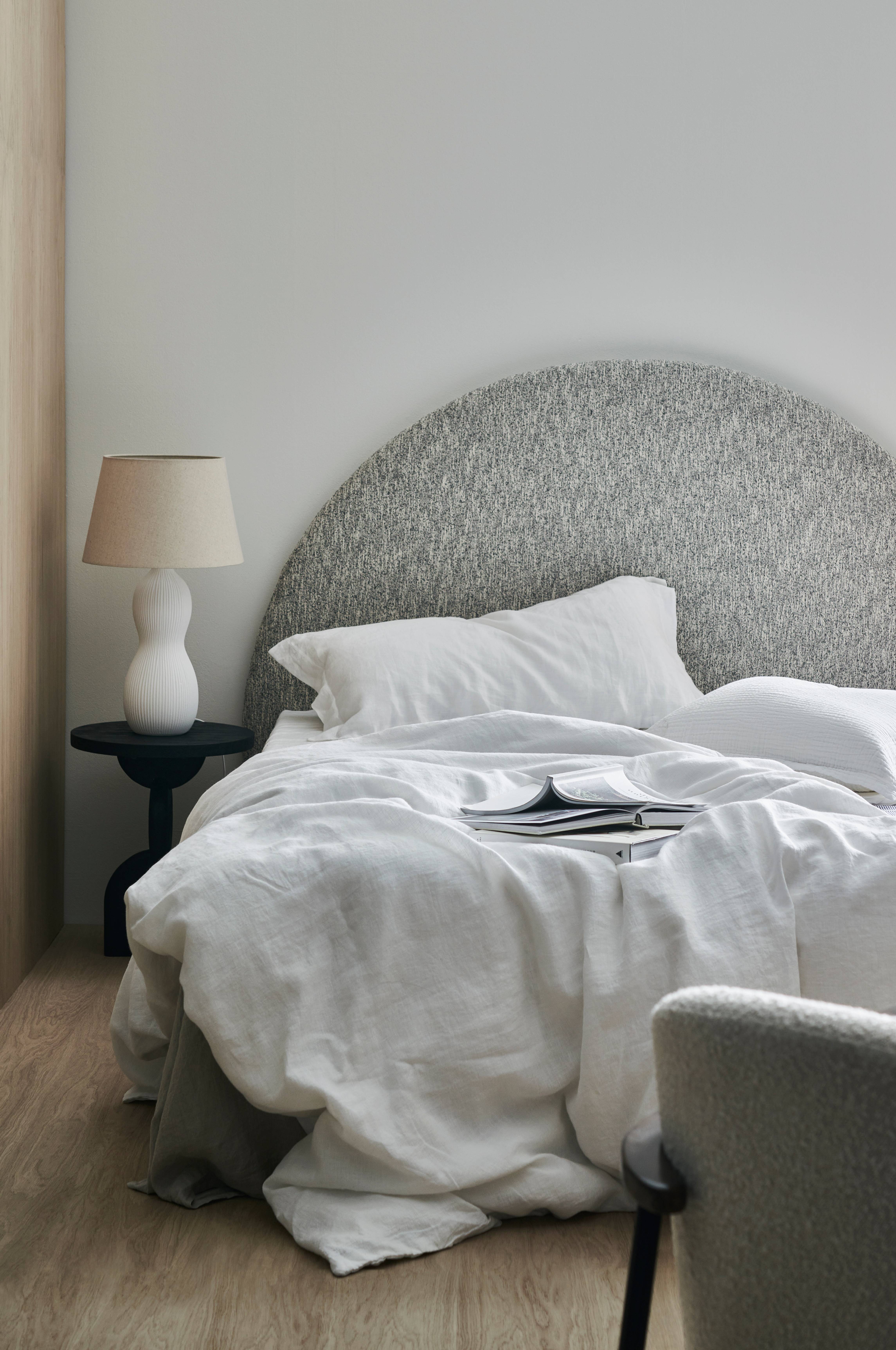 Let vatteret sengegavl med ramme i massivt træ og plywood. Nistret betræk i bomuld/polyester. Fyld af polyestervat. Kan stilles eller hænges.