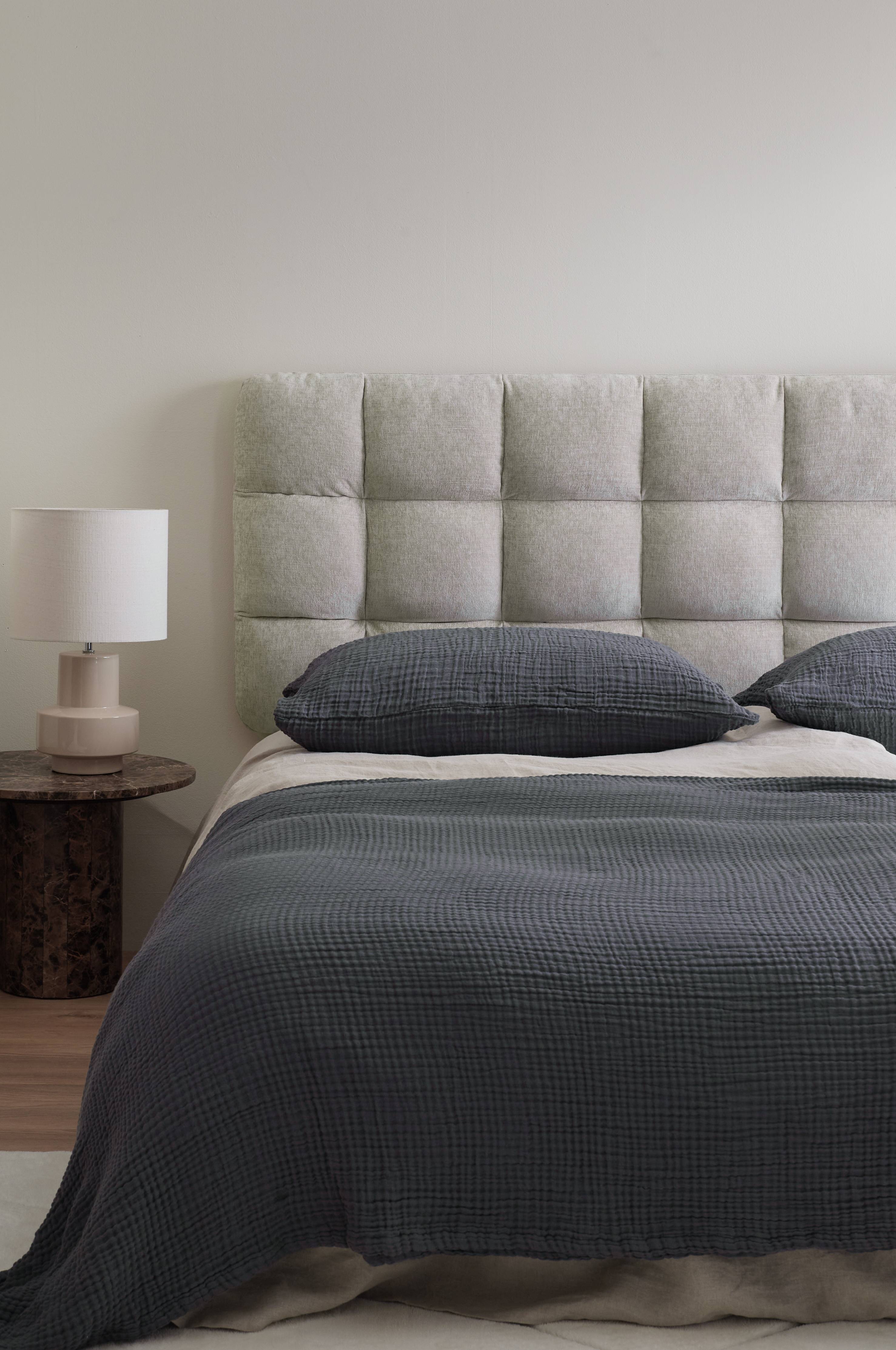 Vatteret sengegavl med ramme i massivt træ og plywood. Betræk i vasket velour af polyester med dekorative sømme som danner et ternet mønster. Fyld af polyestervat. Til vægophængning.