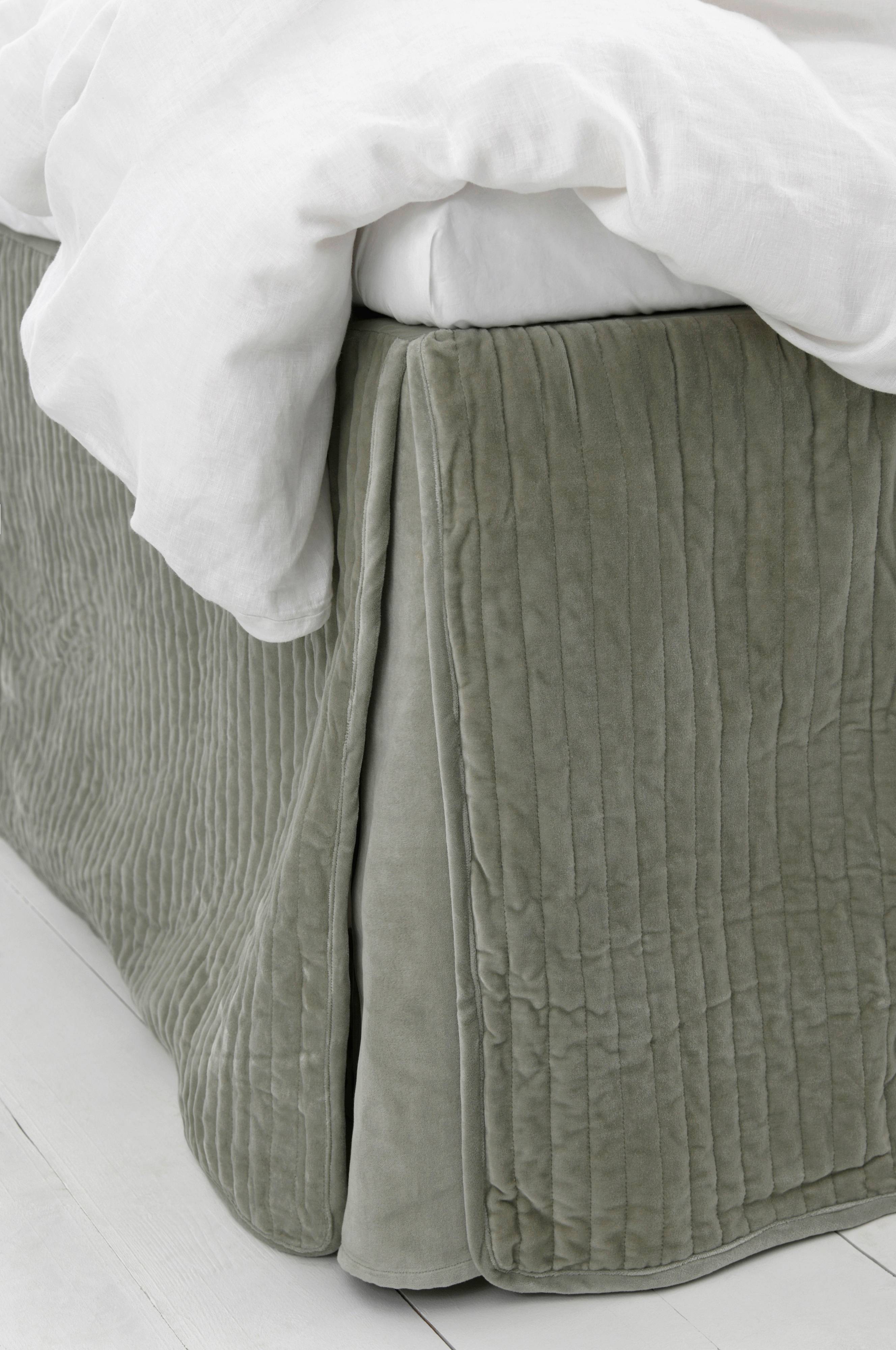 Sengekappe til kontinentalseng med stribequiltet nedhæng i bomuldsvelour og flade af bomuld. Sengekappens højde 60 cm. Leveres i en quiltet skuldertaske som siden kan genanvendes.