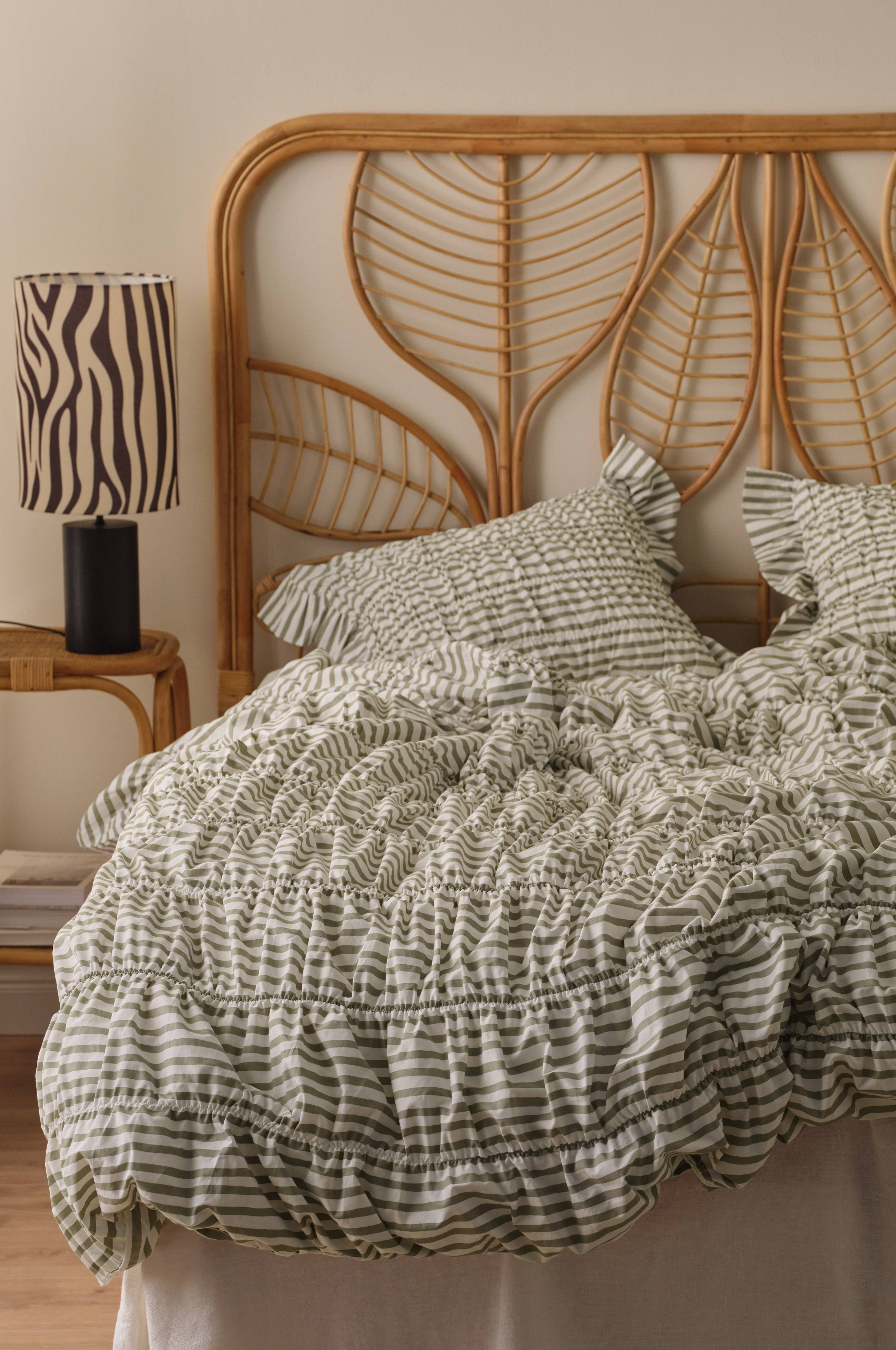 • Forsiden af dynebetrækket og pudebetrækket har en blød, elastisk linning med en dekorativ rynkeeffekt.