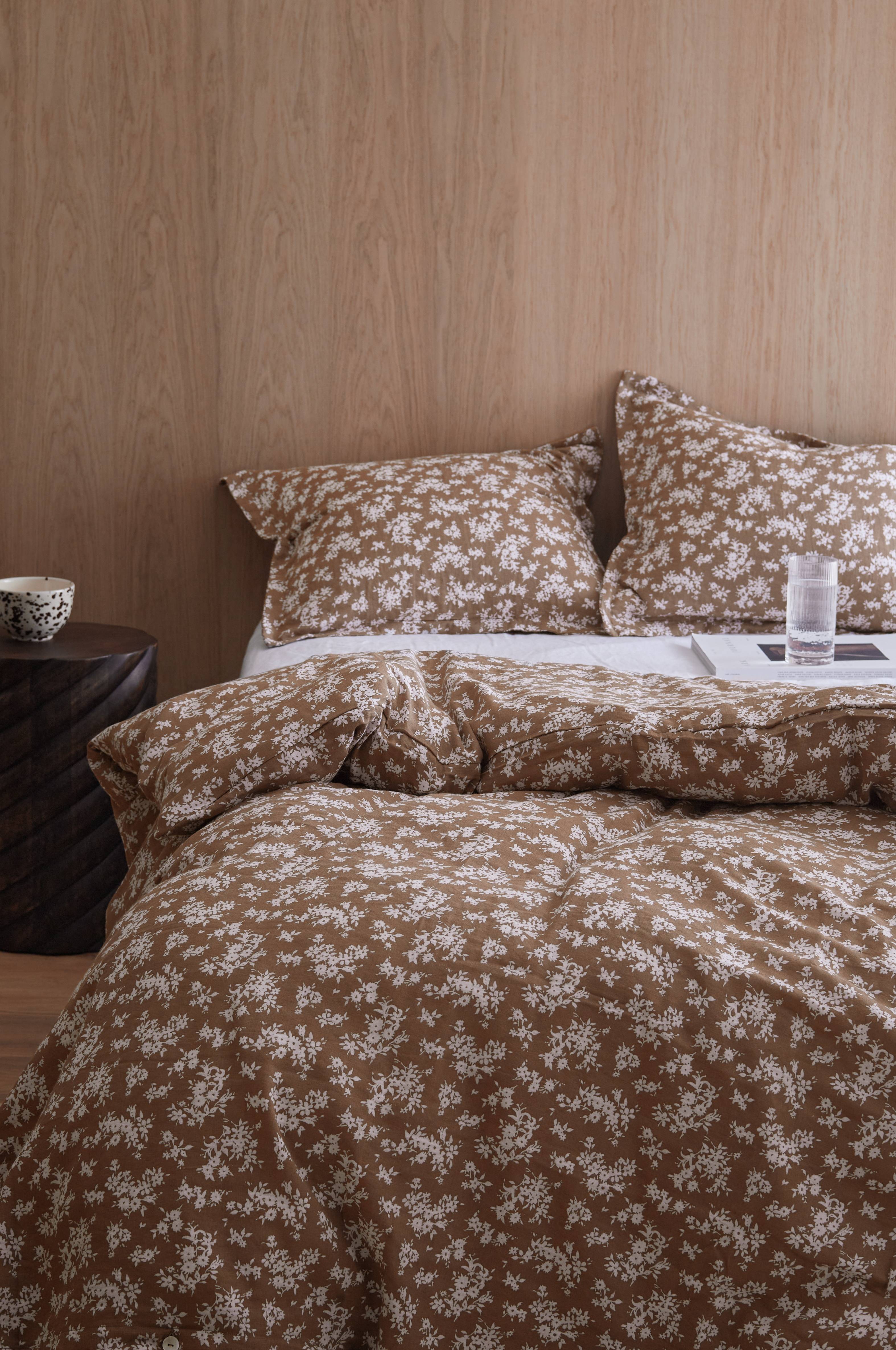 Sengesæt af vasket, økologisk bomuldsmusselin i 2 lag med printet mønster. Dynebetrækket har knapper i kanten forneden. Ingen huller til sengetøjsskift. Pudebetrækket har 2,5 cm vinge rundt om. Trådtal: 230 TC.