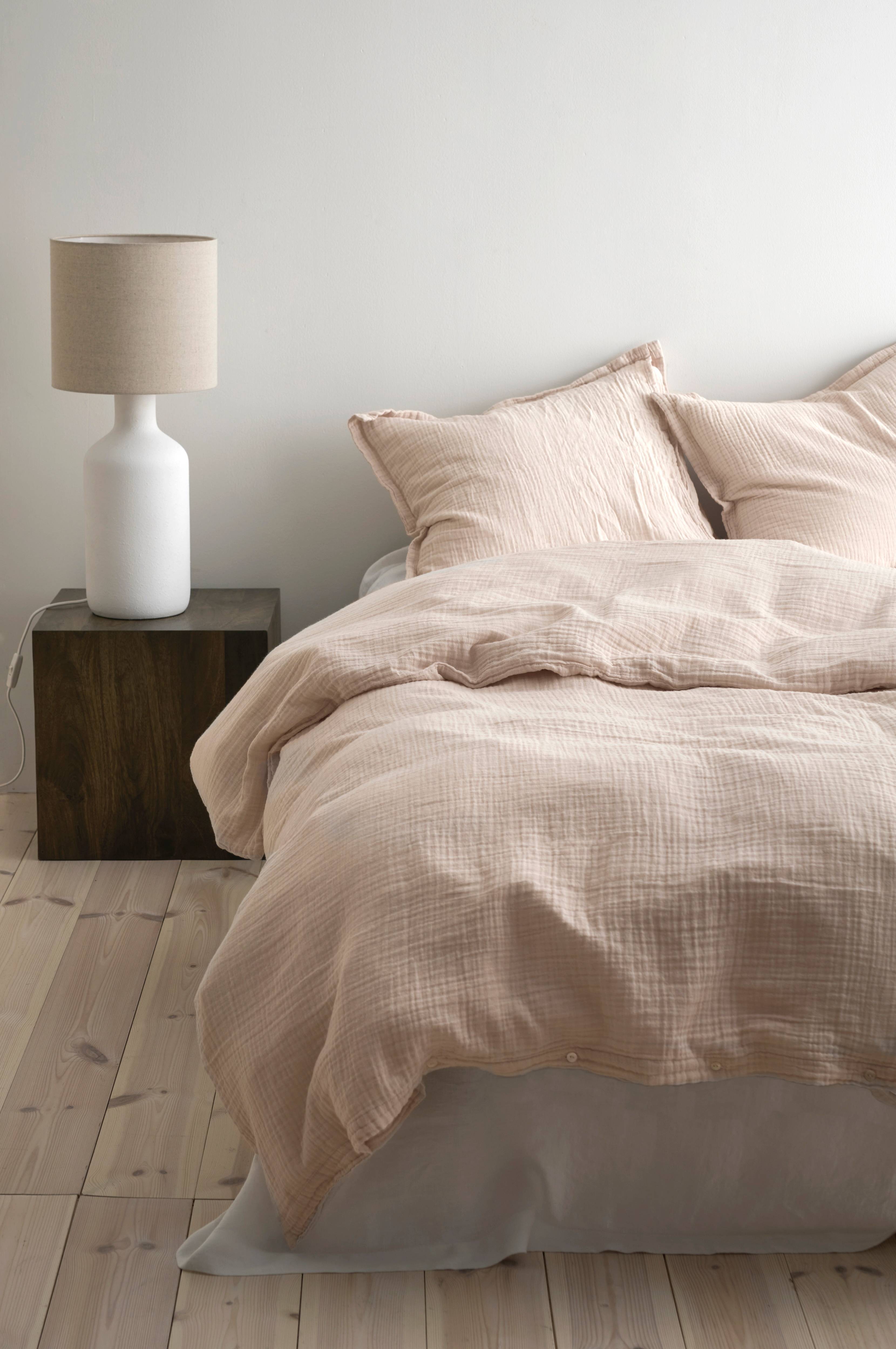Sengesæt i 2 eller 3 dele. Af vasket, økologisk bomuldsmuslin i 2 lag. Dynebetrækket har knapper i kanten forneden. Pudebetrækket har 2,5 cm vinge rundt om. Trådtal: 230 TC. Muslin er et superblødt, luftigt og let struktureret stof med den velkendte rynkede effekt.