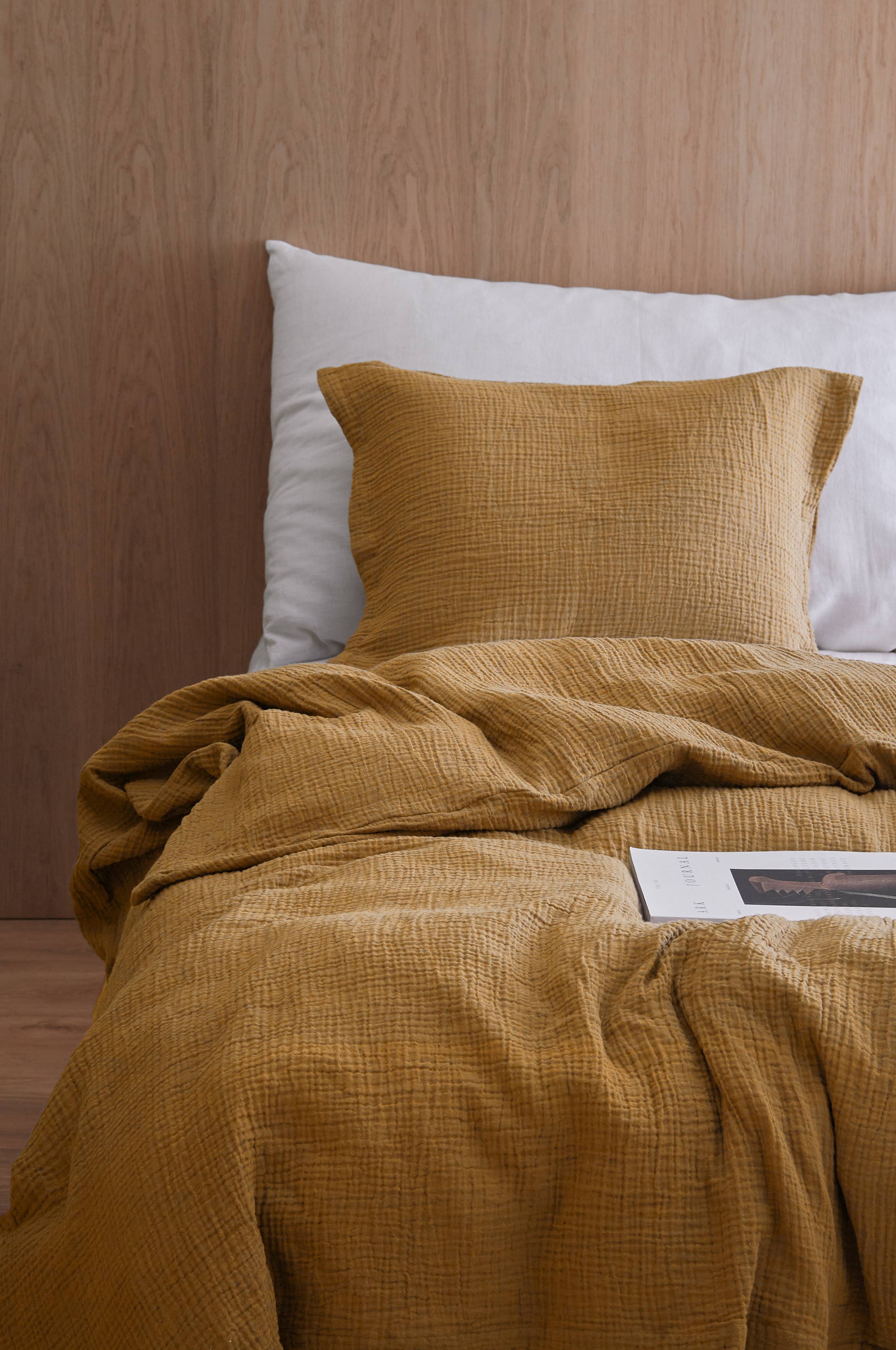 Sengesæt i 2 eller 3 dele. Af vasket, økologisk bomuldsmuslin i 2 lag. Dynebetrækket har knapper i kanten forneden. Pudebetrækket har 2,5 cm vinge rundt om. Trådtal: 230 TC. Muslin er et superblødt, luftigt og let struktureret stof med den velkendte rynkede effekt.