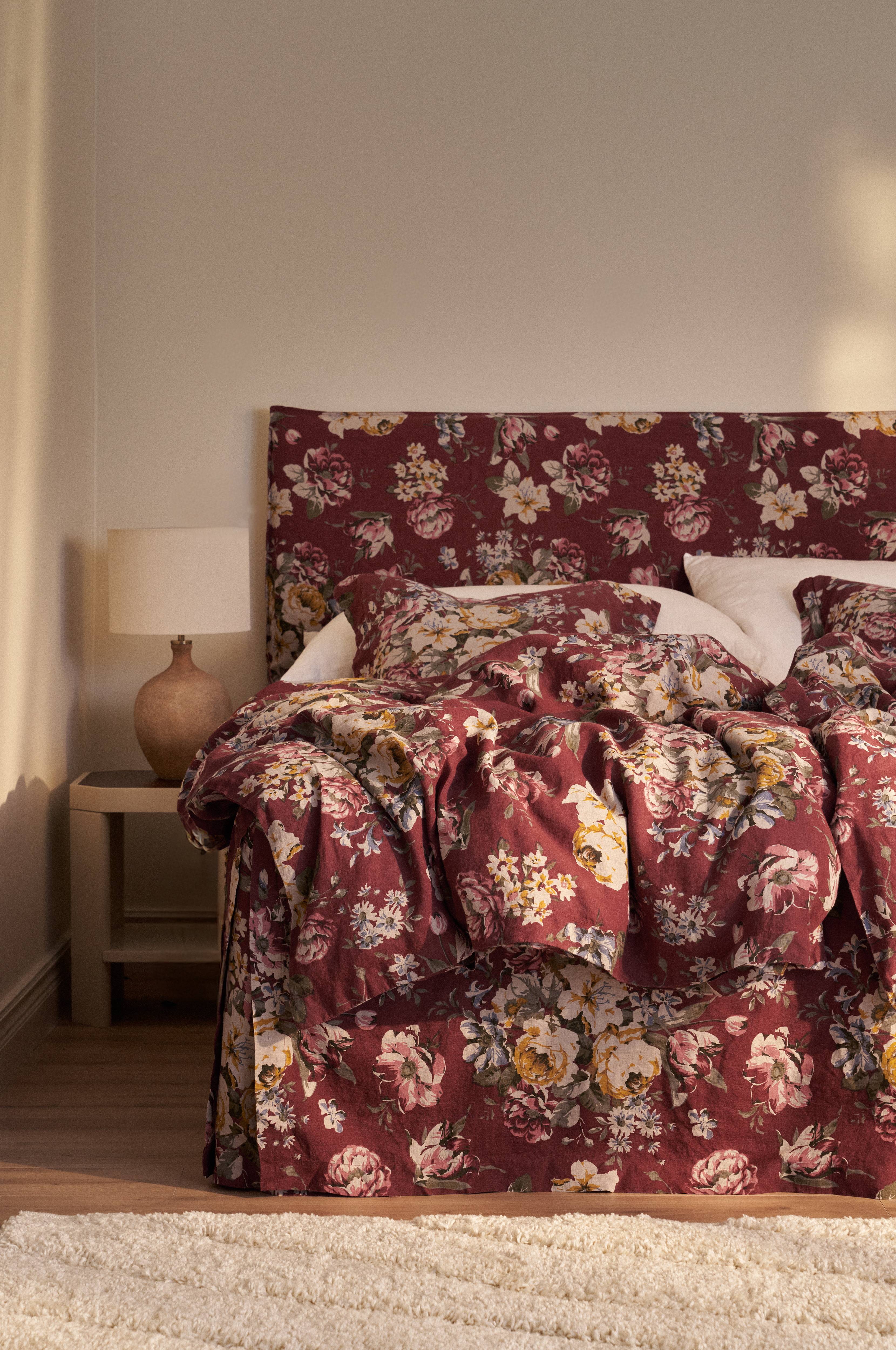 Sengesæt i vintagevasket hørkvalitet af fransk hør med printet rosemønster på synlig hørbund. Dynebetrækket har trykknapper i kanten forneden. Ingen huller til sengetøjsskift. Pudebetræk med 5 cm vinge på kortsiderne. Sættet indeholder 1 dynebetræk 150x200 cm (til enkeltdyne) og 1 pudebetræk 50x60 cm+vinge.