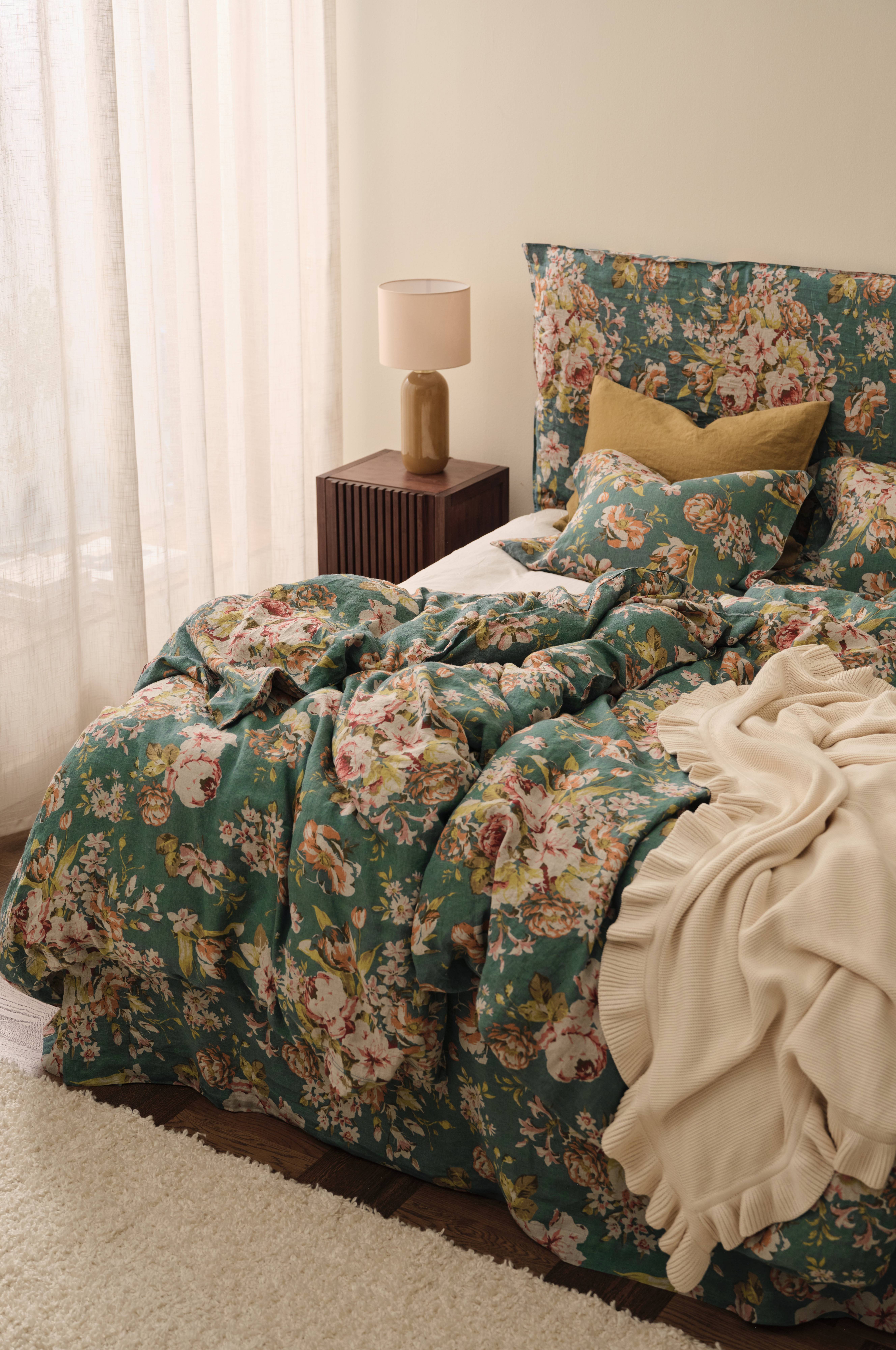 Sengesæt i vintagevasket hørkvalitet af fransk hør med printet rosemønster på synlig hørbund. Dynebetrækket har trykknapper i kanten forneden. Ingen huller til sengetøjsskift. Pudebetræk med 5 cm vinge på kortsiderne. Sættet indeholder 1 dynebetræk 150x200 cm (til enkeltdyne) og 1 pudebetræk 50x60 cm+vinge.