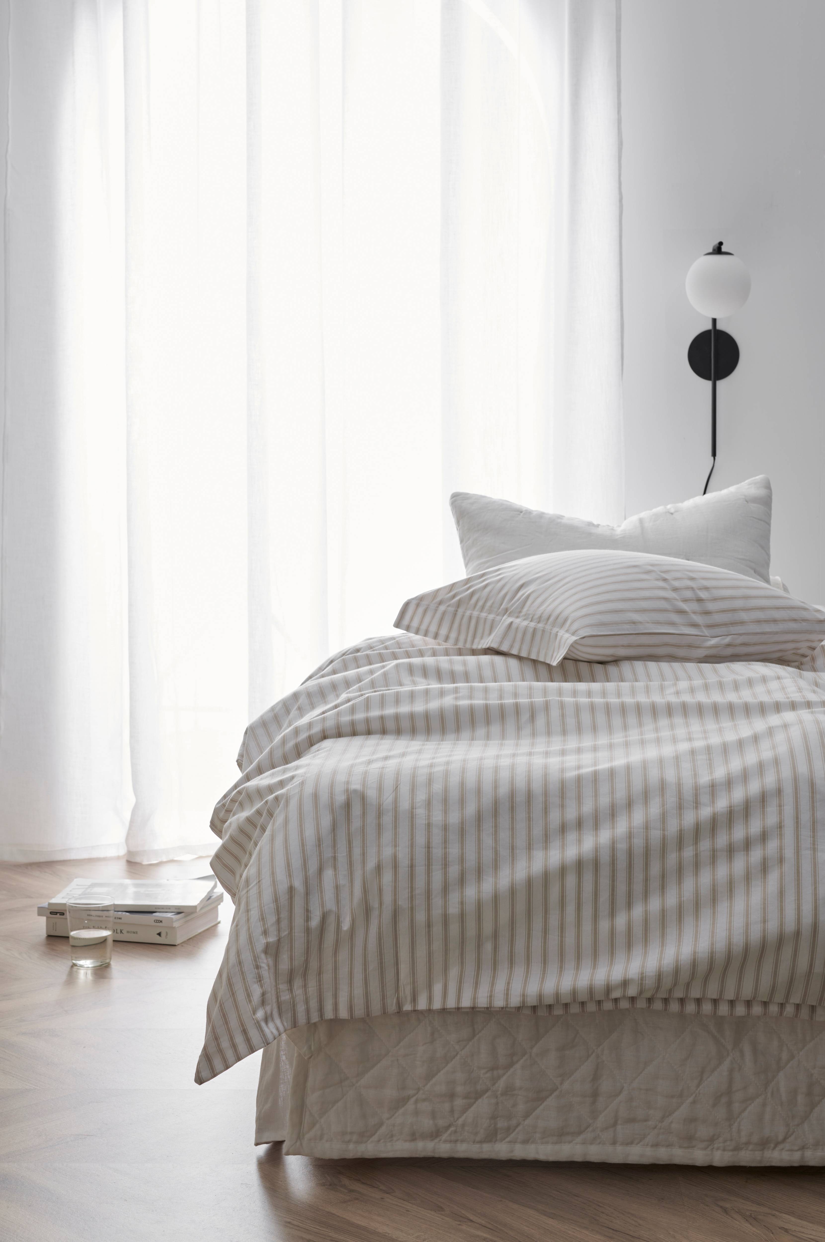 Sengesæt i percale af økologisk bomuld med garnfarvede striber. Percale er en luksuriøs, tætvævet kvalitet i finkæmmet bomuld med glat overflade som er svalt og blødt. Dobbelte jeanssømme hele vejen rundt om både dyne- og pudebetræk. Dynebetræk uden huller i siden til brug ved opredning. Trådtæthed 180TC. Leveres i stofpose i samme kvalitet med snøreåbning. Stofposen kan genbruges.